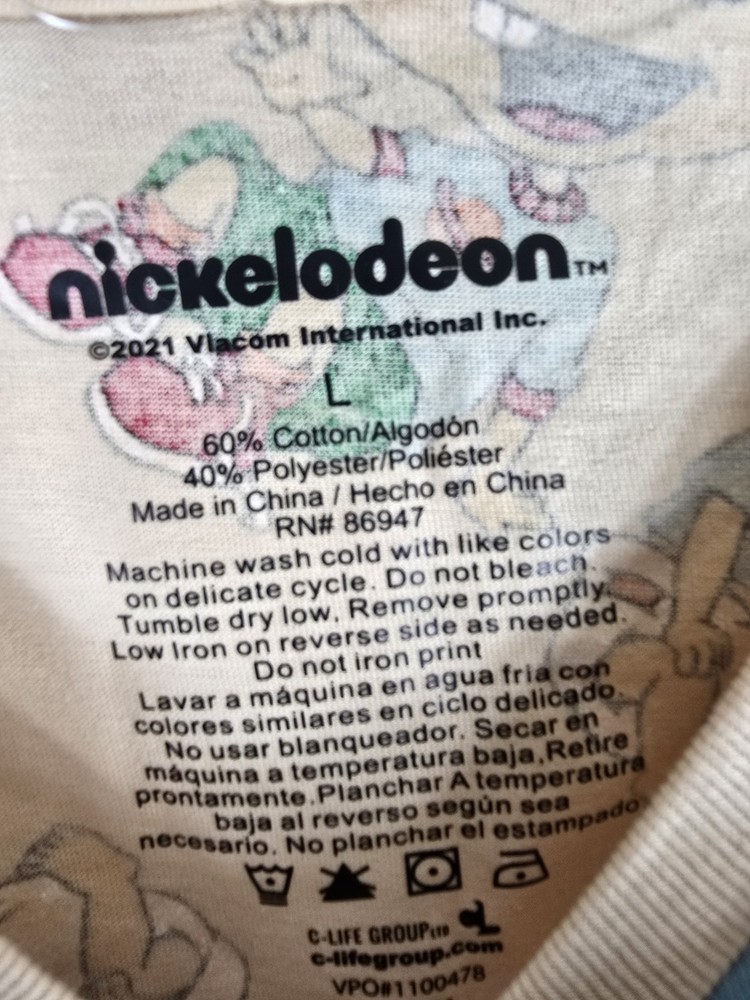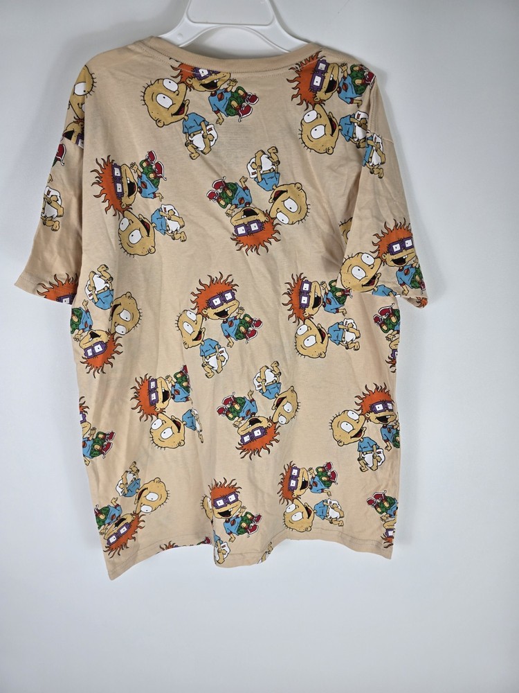 The Nickelodeon Rugrats T-Shirt is a classic piece featuring a graphic print of Tommy and Chucky. This short sleeve t-shirt in beige color is made from a blend of polyester and cotton, making it machine washable for easy care. With a crew neck and regular fit, this t-shirt is perfect for fans of 90s cartoons and the Rugrats show, adding a nostalgic touch to any wardrobe.