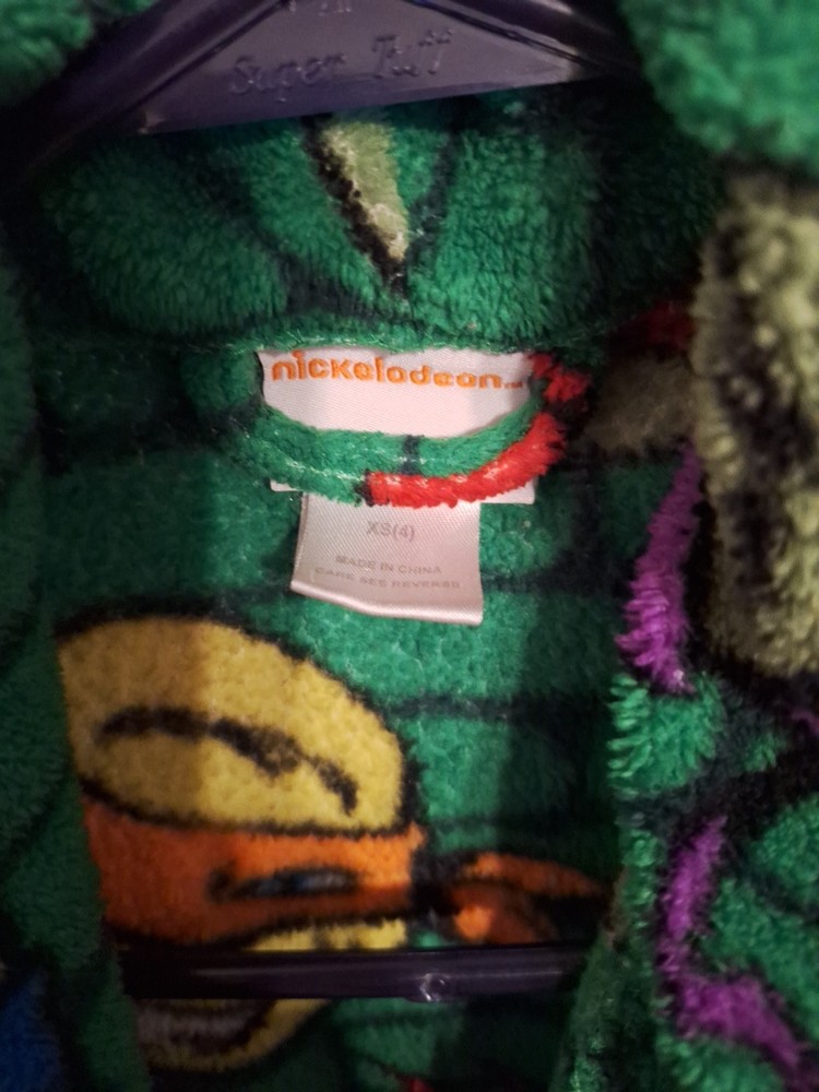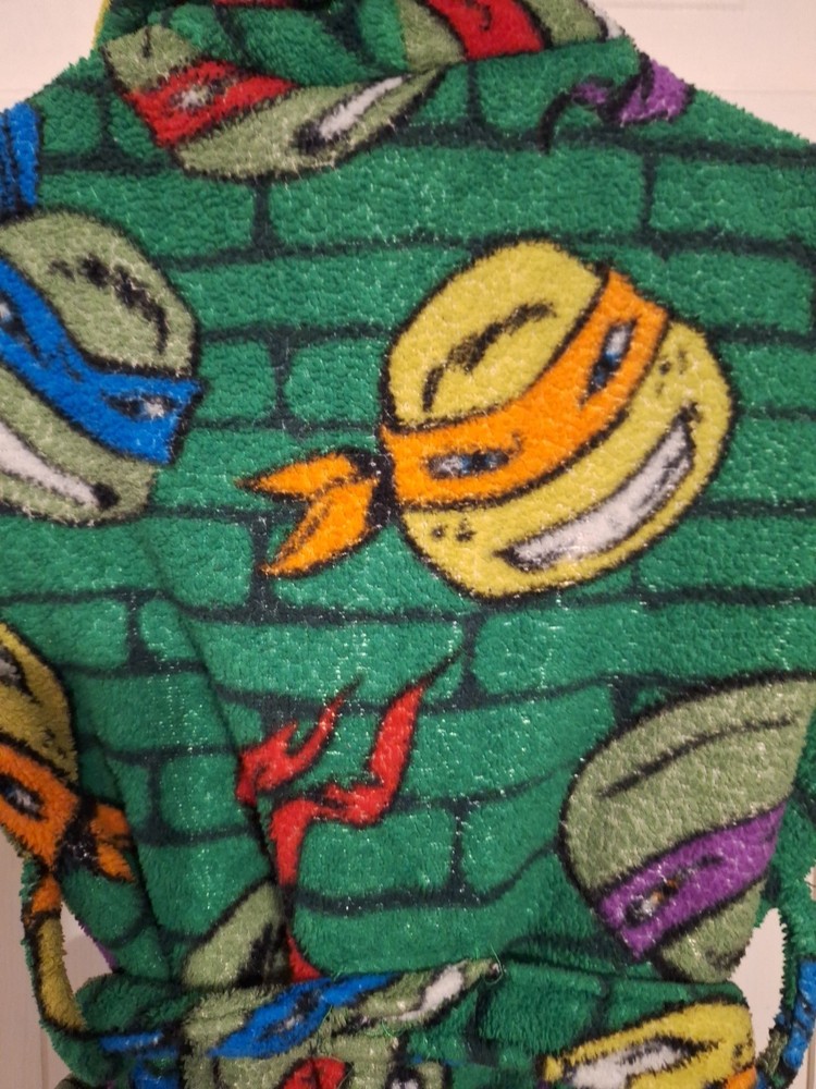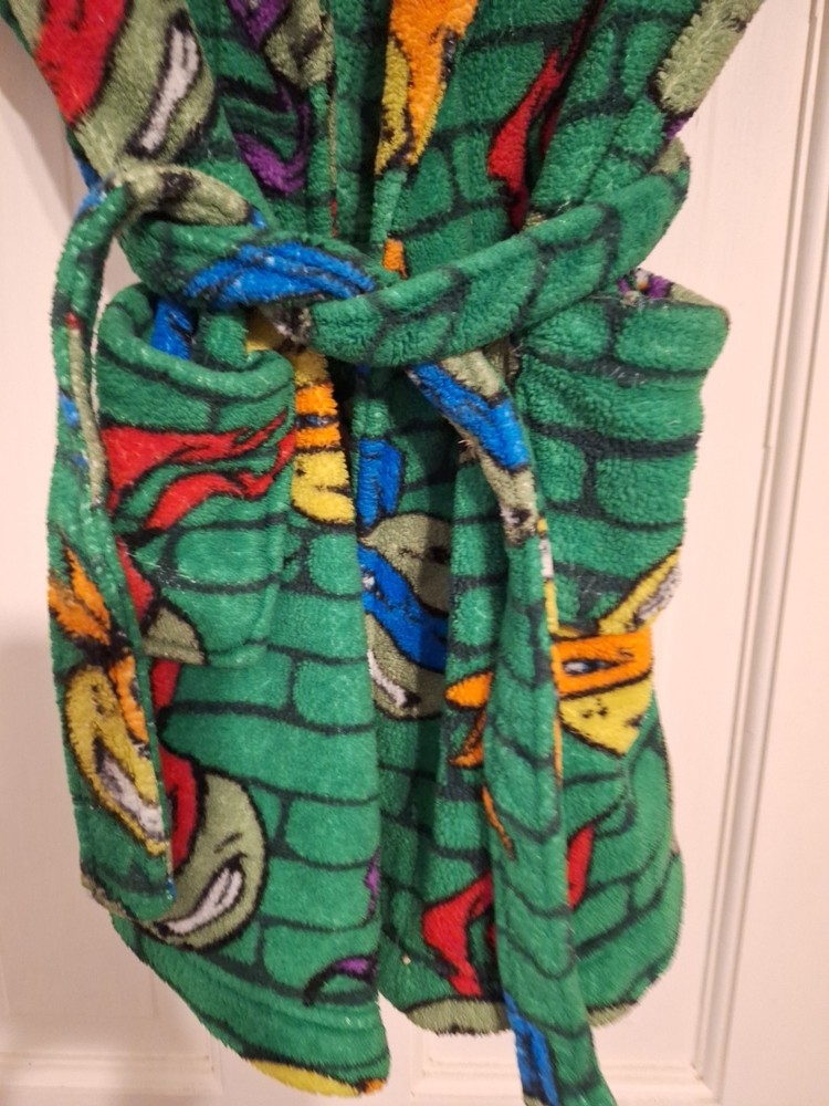 The Nickelodeon Teenage Mutant Ninja Turtles Boys Robe in size XS is a cute, cozy, and warm outerwear option for young boys. Made from a cozy polyester blend fabric, this 2-piece robe features a graphic print of a turtle, perfect for fans of the Teenage Mutant Ninja Turtles. The green color and cartoon theme make it a fun and playful choice for all seasons, with adjustable belt straps for a comfortable fit. Lightweight and suitable for winter, summer, fall, and spring, this Nickelodeon robe is a versatile addition to any boy's wardrobe.