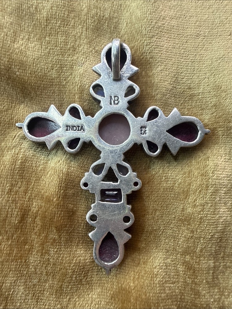 ✨ Nicky Butler Gemstone Cross Pendant & Necklace – Sterling Silver (925) ✨ Beautiful and eye-catching Nicky Butler cross pendant featuring a stunning mix of genuine gemstones set in solid sterling silver. This piece has a bold, dimensional design with rich color and classic artisan detailing. Details: • Brand: Nicky Butler • Metal: Solid Sterling Silver (marked 925) • Country of Origin: India (stamped) • Gemstones: Mixed natural stones including pink center cabochon, ruby-tone faceted stones, moonstone, and purple stones (likely amethyst or garnet) • Pendant Style: Ornate gemstone cross • Includes: Pendant + necklace chain (as shown) • Finish: Oxidized sterling for depth and contrast Condition: Very good vintage condition. Stones are secure. Light surface wear consistent with age and normal use. Please review all photos for exact condition and details. This is a beautiful statement piece — perfect for collectors of Nicky Butler jewelry, gemstone lovers, or anyone who loves bold, spiritual-inspired designs. 💖✝️ ✨ Offers are welcome — feel free to send one! 💌📬