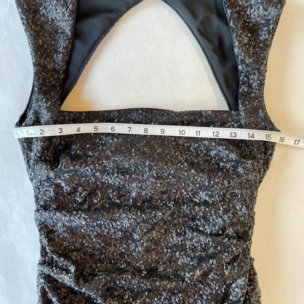 EUC - no stains, holes, pulls or pilling. All sequins are intact. Excellent condition. Turn every head in the room in our sequin ruched sheath dress. Made with matte black metallic sequins and featuring a cut-out style back and square neckline. This knee-length dress in sure to turn heads. Pair with strappy heels for your next event. 100% Polyester Sizing varies from brand to brand, please use measurements in photos to decide if this will fit. Unless otherwise specified, this is a preowned item with normal signs of wear. There is no notable damage or stains. Please see all photos for exact item condition. Wash to wear. Ships from a smoke-free home! Thanks for checking out my store! All items ordered before 10am PST ship same day. Orders received after 10am PST ship the next morning. Make a bundle to save on shipping costs.