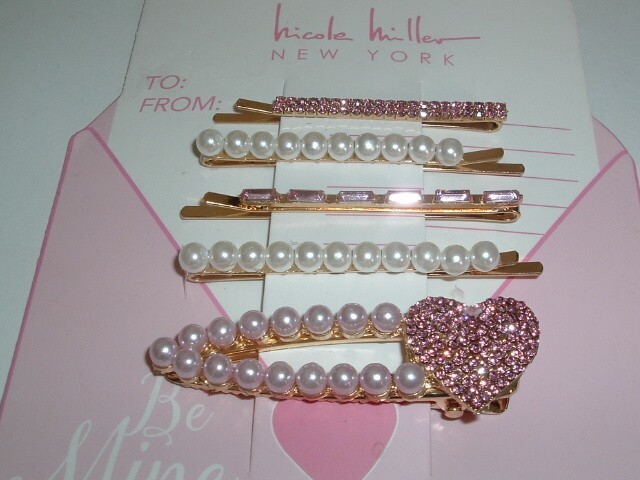 A darling hair set by Nicole Miller New York with 4 golden bobby pins with white pearls and chaton cut and baguette cut, pink rhinestones and a hair clip of pink pearls and pink rhinestone heart. All new, still on original "Nicole Miller Be Mine" card. Half priced.