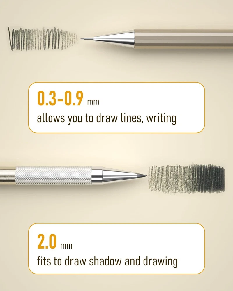 SPECIFICATION: MATERIAL: Metal SIZE: (0.3mm, 0.5mm, 0.7mm, 0.9mm) HB, 2.0mm (2H | HB | 2B | 4B | 12 COLORS ) PACKAGE INCLUDE: 4 × HB Pencils, 1 × Graphite Lead Holders, 4 × Lead Refills, 4× Graphite Lead Refills, 1× Color Lead Refills, 2 × Erasers, 2 × Lead Pointer, 9 × Cap Eraser Refills 【VALUED PACKAGE】: Come with 5 PCS drafting pencils ( 0.3/0.5/0.7/0.9/2.0), with 9 tubes of lead refill in 0.3mm 0.5 mm & 0.7mm & 0.9mm (HB) + 2.0 mm(4B, 2B, HB, 2H, CR) , 2 pcs erasers, 9 pcs cap eraser refill, 2 lead sharpener, a cute storage case for orderly organized 【PREMIUM QUALITY】The full-brass metal body provides ideal weight balance for fatigue-free writing and drawing. It brings you more effective and high quality tasks. 【4 PCS Mechanical Pencils】: 4 mm tip length makes it ideal for use with rulers and templates, various line size (0.3 mm,0.5 mm,0.7 mm & 0.9 mm) satisfy your demand. Polygon shape of these mechanical writing pencils avoids sliding on drawing tables. In addition, the pencil is pre-loaded with a 90mm-lead. (with each 60pcs extra lead refill for 0.3, 0.5, 0.7, and 40pcs 0.9 pencil lead refill.) 【2 PCS 2mm Lead Holder】: Metal Threaded Anti-skidding pen tube with sharpener in the cap of 2.0 mm mechanical pencil, Extra 2pcs lead sharpener are also provided for the 2.0 lead to keep the fine point as they dull. And an extra colored lead refill for your wonderful painting. 【PERFECT GIFT】Ideals for artists, professionals, teachers and students alike. Perfect for writing, drafting, drawing, sketching. The pencil set is especially as Christmas Gift Pencils for children, friend, workmate or family that with a exquisite case.