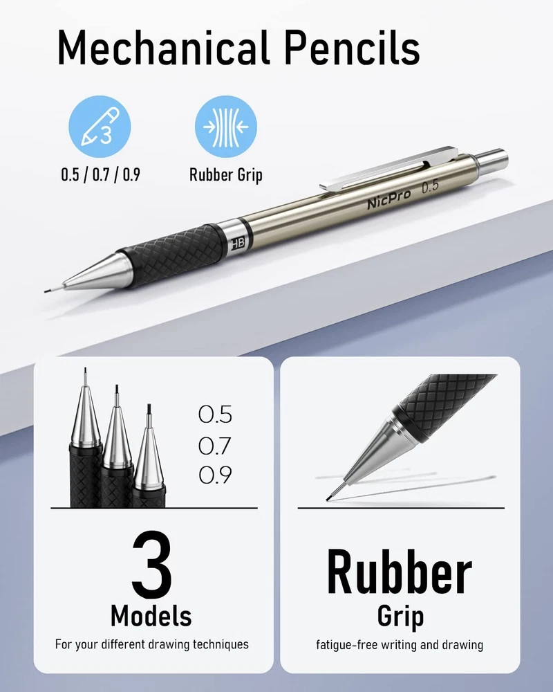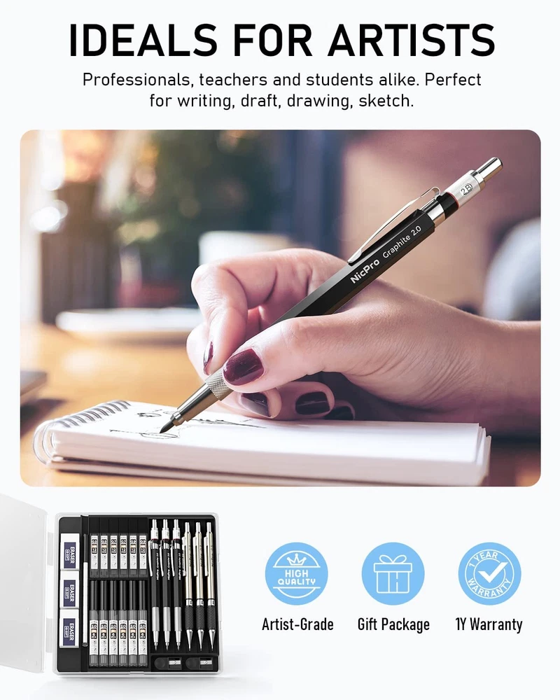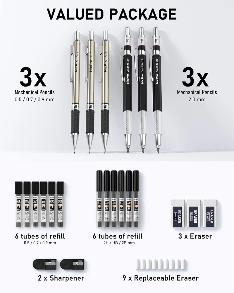 Easy replace refills 1.pencil. Press the top of button and make it no sprang back. Inset this refill and adjust the refill as a safest length 2.Please kindly be noted that the refills you should make it shorter as you could write. It will as larger as great assistance for protection for your refill being broken. Package Included: 3 x Mechanical Pencils 0.5-0.7-0.9mm leads 3 x Graphite Lead Holders 2B-HB-2H pencils 6 x Lead Refills (24 refills for each 0.5-0.7-0.9 mm) 6 x Graphite Lead Refills (12 refills for each 2B-HB-2H pencil) 3 x Erasers (5x2x1 cm) 6 x small cap erasers refill Value Package :Come With 6 PCS mechanical drafting pencils ,including 0.5 mm & 0.7mm & 0.9mm and 2mm ,12 tubes of refill : 0.5mm & 0.7 mm & 0.9mm ,2.0 mm (2B HB 2H) , 3 PCS of erasers , 9PCS of cap eraser refills, 2 PCS sharpener and a mechanical pencil case 4 Line Size & 3 Hardness: This awesome pencil set come with several size of lead refills for various line widths:0.5/0.7/0.9/2.0,the 2mm graphite pencil come with 3 hardness lead 2B HB and 2H to create different darkness, perfect for your daily use,they don't break easily, and write smoothly Ergonomic, Comfortable Design :The full-metal body provides ideal weight balance for fatigue-free writing and drawing or sketching, It brings you more effective and high quality tasks. The lead advances easily at the touch of a click. There is a sharpener in the cap of 2.0 mm mechanical pencil Two Type Anti-Slip Grips: Rhombus textured rubber grips and metal threaded anti-skidding, these pencils adopt different grip design base on pencil weight and applicable scene, only for better experience Perfect School Supplies :Ideals for teachers and students, artists, professionals,engineer alike. Perfect for writing, drafting, drawing, sketching or architectural working. Back to the basics! it will be also a great gift for your kids,parents,other family members and friends
