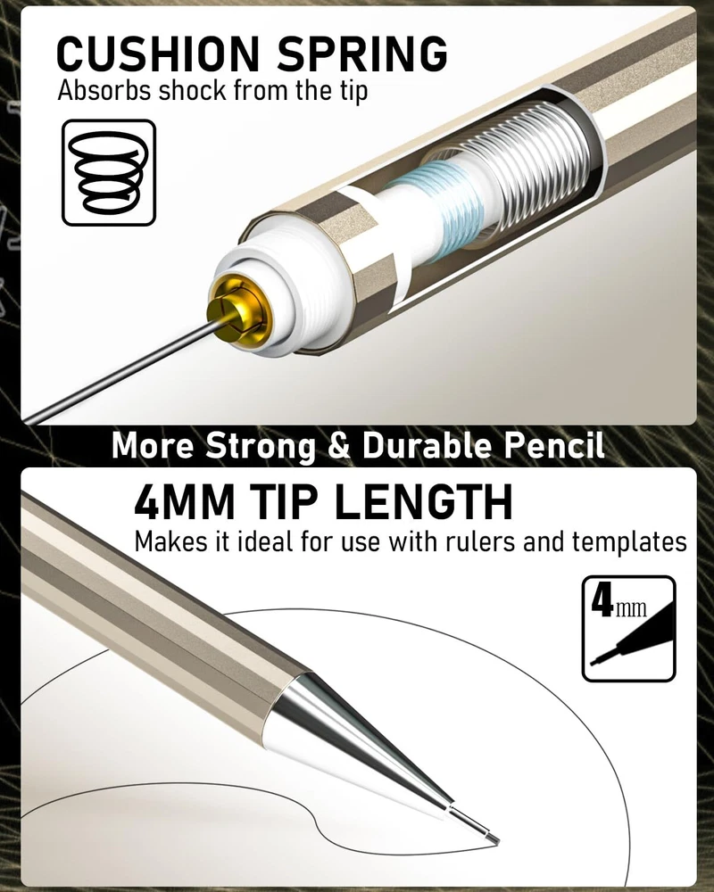 Come with 6 PCS drafting pencils and 8 tubes of lead refill in 0.3mm 0.5 mm & 0.7mm & 0.9mm (HB) + 2.0 mm(4B, 2B, HB, 2H) carbon based , 2 pcs erasers, 9 pcs cap eraser refill, 2 lead sharpener, updated storage case packaging The full-brass metal body provides ideal weight balance for fatigue-free writing and drawing. It brings you more effective and high quality tasks. 4 PCS Mechanical Pencils : 4 mm tip length makes it ideal for use with rulers and templates, various line size (0.3 mm,0.5 mm,0.7 mm & 0.9 mm) satisfy your demand. Polygon shape of these mechanical writing pencils avoids sliding on drawing tables. In addition, the pencil is pre-loaded with a 90mm-lead. 2 PCS 2mm Lead Holder: Metal Threaded Anti-skidding pen tube with sharpener in the cap of 2.0 mm mechanical pencil, Extra 2pcs lead sharpener are also provided for the 2.0 lead to keep the fine point as they dull. Perfect School Supplies:Ideals for artists, professionals, teachers and students alike. Perfect for writing, drafting, drawing, sketching