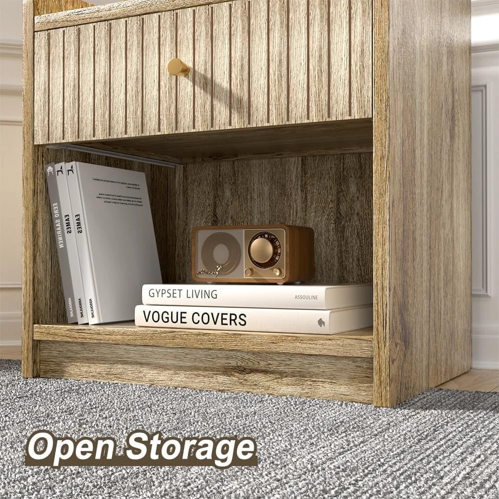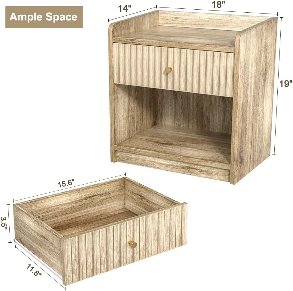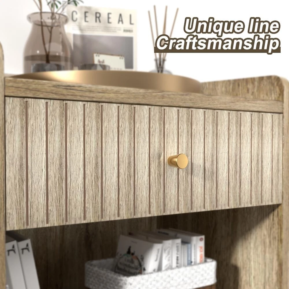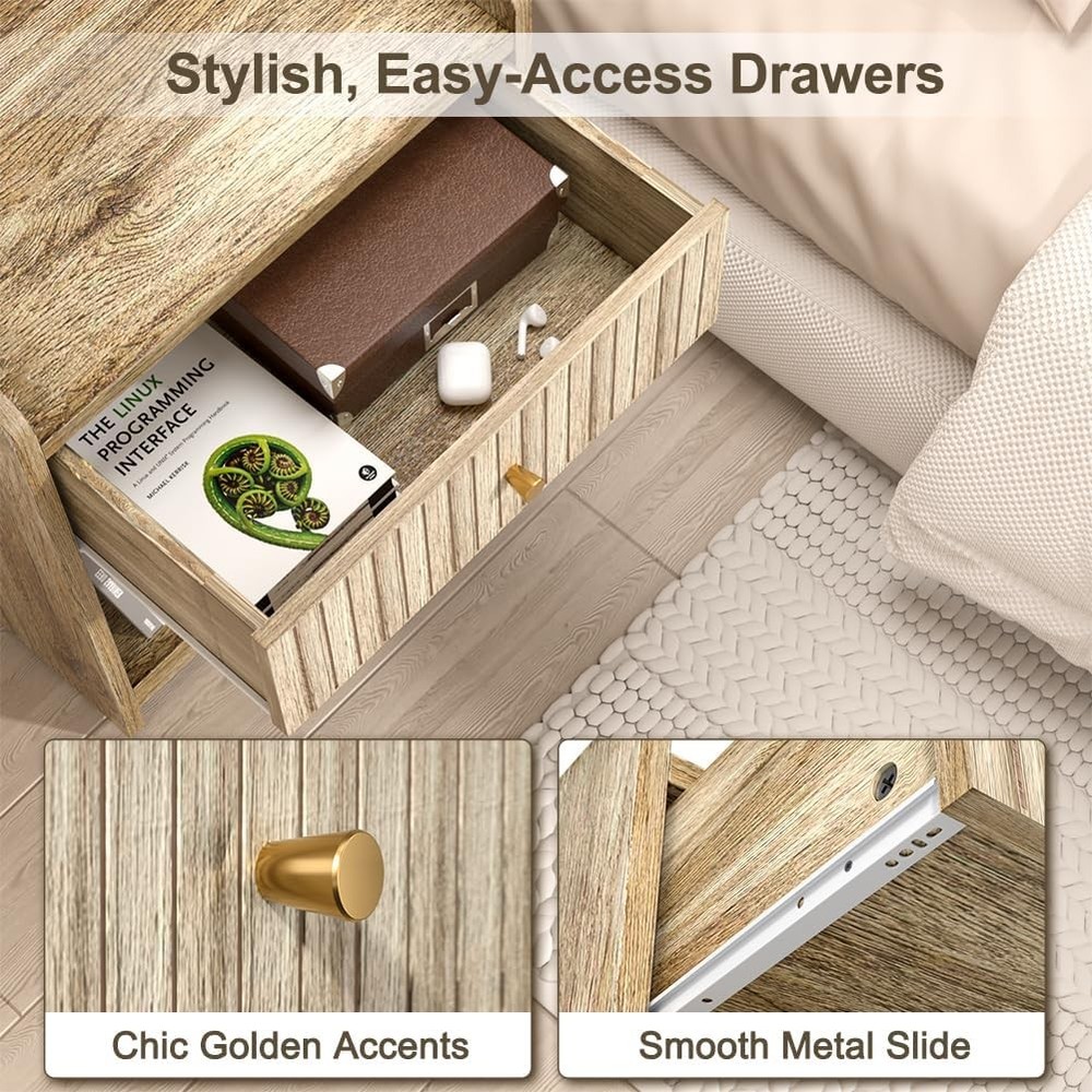 Nidouillet Nightstands Set of 2, Bedside Tables with Drawer, 2 Pack, Natural Product Details Brand: Nidouillet Maximum Weight Recommendation: 11 Kilograms Color: Natural Table design: Nightstand Style: Modern Item WeightFrame Material: 22 PoundsEngineered Wood Top Material TypeShape: Engineered WoodRectangular BRIGHT AND MODERN DESIGN - Nidouillet light yellow nightstands with natural wood grain bring warmth and style to your space. Perfect for creating a cozy, modern vibe in any bedroom, living room, apartment or office. DURABLE & EASY TO MAINTAIN - Made from premium MDF, night stand set 2 are built to last. Bedside table's smooth surface is not only durable but also super easy to clean–just a quick wipe, and it’s good as new! ELEGANT DECORATE DETAIL - The gold-tone handles on the drawers add a luxurious touch, making nightstands as functional as it is stylish. The unique striped groove finish makes the bedside table more chic. suitable for various styles of home decoration, deliver perfect visual effect, add charming to your home. DOUBLE THE STORAGE - With a roomy drawer and open shelf on each night stand, you get twice the storage space for books, glasses, chargers, or anything else you need to keep close. The surface of the side table is large enough to place a table lamp and cups on it. ASSEMBLY&AFTER-SALES - Don’t stress about setup – clear instructions and All kinds of screws are labeled and packaged individually, and all boards are also labeled, it's very convenient to you for install the bed side tables. If any accessories are missing, please contact us and we will send you replacement accessories within 12 hours.