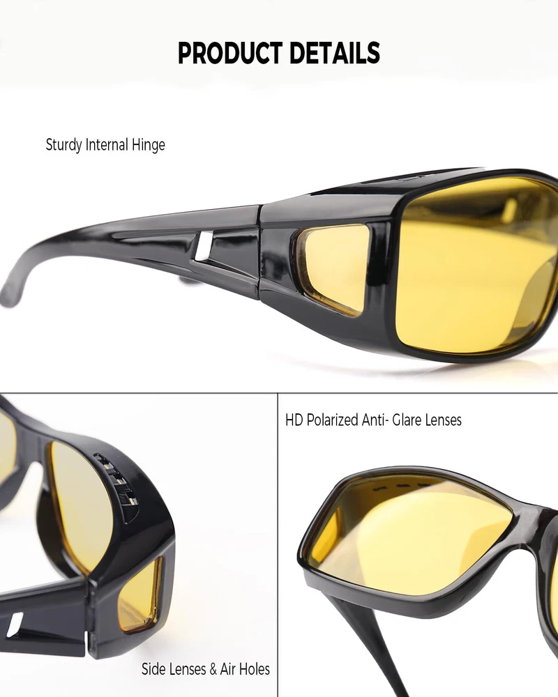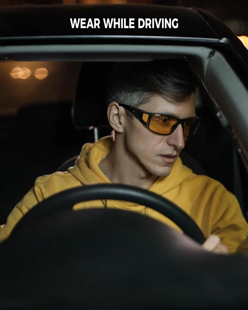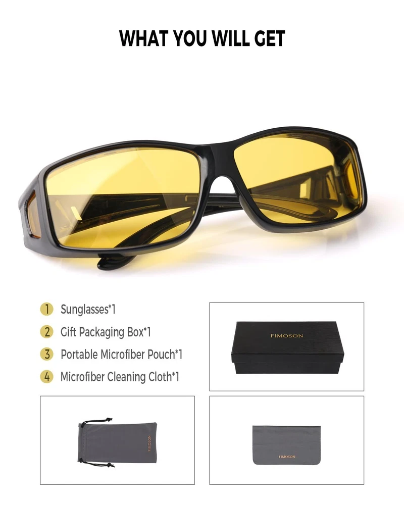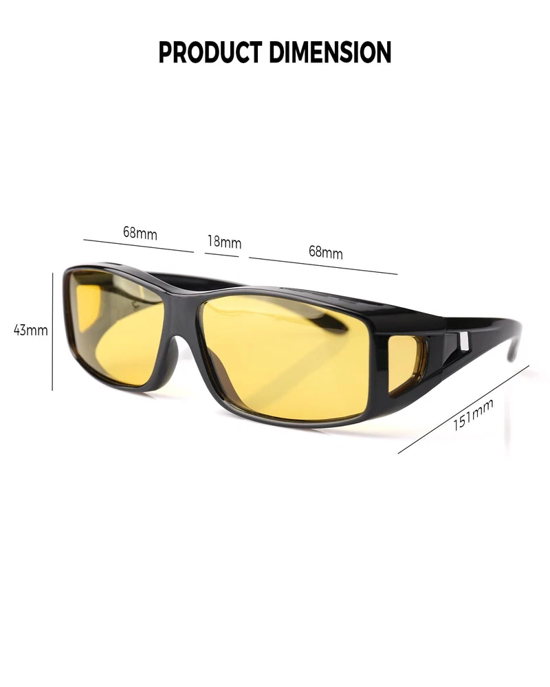 HD NIGHT VISION POLARIZED LENSES: HD polarized yellow lenses come with a special anti-reflective coating to effectively reduce glare from oncoming headlights and bright street lights, enhancing night vision performance and ensuring safe driving. Anti-glare lenses also provide greater clarity in foggy, overcast, rainy, night-time, and other low-light conditions, making them the perfect choice for night driving, motorcycle riding, cycling, running, walking, fishing, and other outdoor activities PREMIUM QUALITY MATERIALS: night vision glasses feature a durable, shatterproof frame, polarized shatter-resistant TAC lenses, and a sturdy flexible internal metal hinge structure. Additionally, they are designed with comfortable concave nose pads, non-slip temples, side lenses for improved peripheral vision, and anti-fog air holes for long-lasting wear. Every detail ensures a perfect wearing experience, offering all-day comfort WRAP AROUND DESIGN: night vision driving goggles for men women feature an excellent ergonomic wrap-around design, offering a larger coverage area to protect the eyes and face. The side lenses can provide better peripheral vision and glare protection. night driving glasses can also be conveniently worn over regular glasses (such as prescription glasses, myopia glasses, or reading glasses) as well as used directly without prescription lenses PRODUCT DIMENSION: Lens width: 68 mm (2.68 inches) | Lens height: 43 mm (1.7 inches) | Bridge: 18 mm (0.7 inches) | Frame length: 152 mm (6 inches) | Temple length: 151 mm (5.95 inches) night vision glasses offer exceptional durability and superior visual clarity and are specially designed for men women nighttime driving. Whether you are a man or woman, durable functional night vision glasses fully meet your expectations! PACKAGING & : Each pair of sunglasses includes sunglasses*1, microfiber pouch*1, microfiber glasses cleaning cloth*1, glasses box*1, designed to clean and protect your lenses from scratches and damage. sunglasses also come with exquisite packaging, making them a perfect, practical, .Enjoy premium brand that ensures a satisfying shopping experience with every purchase!