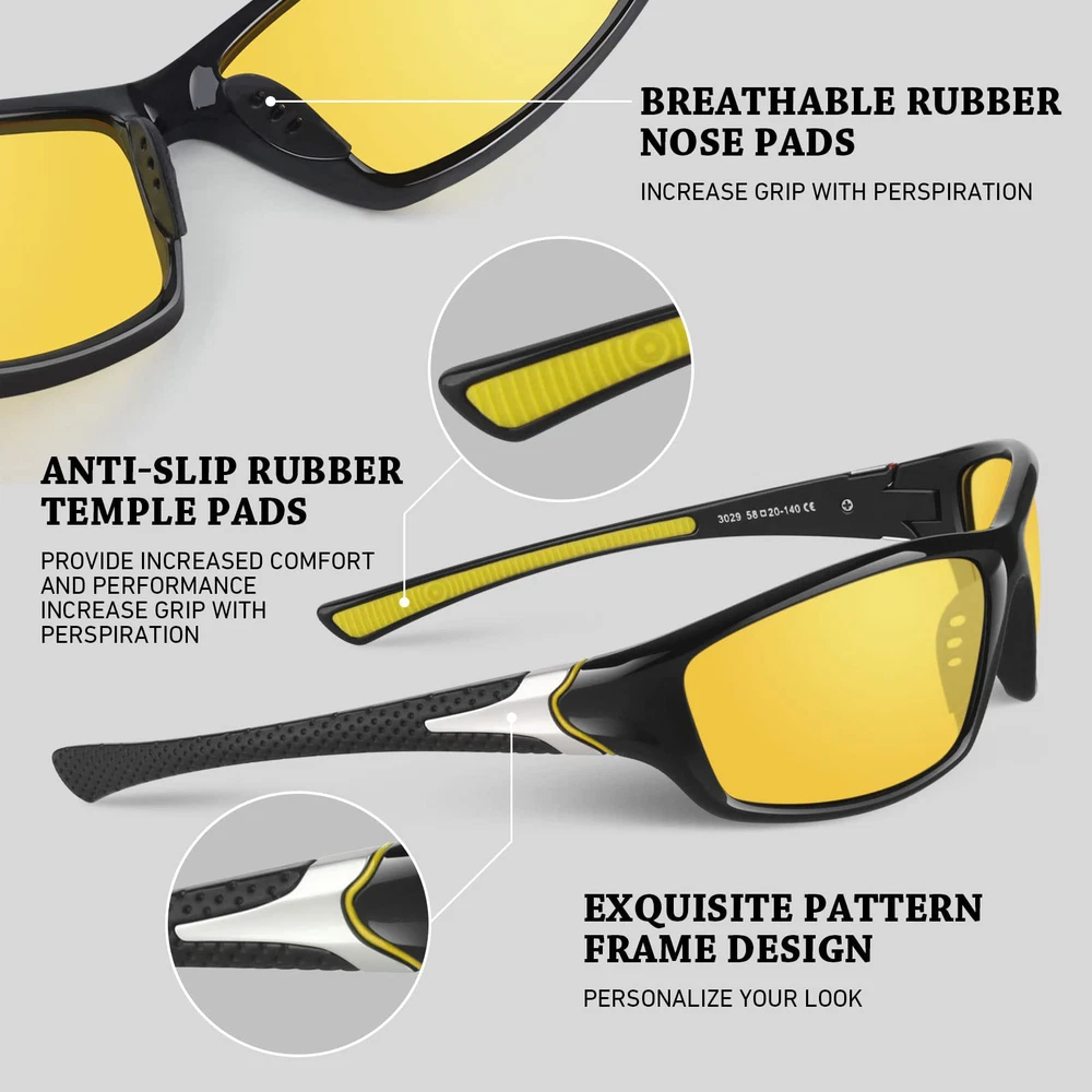 🎣HD POLARIZED NIGHT VISION LENS►The optical-grade Anti-Reflective coating on Night Vision lens helps to cut glare, working to protect your vision from distortion and help you see better.Our exclusive micro-infused amber lenses also provide enhanced visual definition and contrast. This helps to improve your ability to detect and distinguish objects when driving at night. 🚴WRAP DESIGN & ULTRA LIGHT FRAME►8-Base wrap design perfectly shield your eyes from wind & dust and help you stay fully focused during your favorite activity.These sunglasses frames are strong but lightweight,you can hardly feel them on daily outdoor activities. 🏄IDEAL FOR ANY OUTDOOR SPORTS►Best for fishing, boating, sailing, jet skiing, driving, running, cycling, climbing, hiking and traveling. You can barely feel it on your face even wear it all day, a reliable partner when you enjoy outdoor. Fashion and stylish design, with rich color combinations of frames and lenses is also suitable for daily wear. 🏌PRODUCT SIZE►FRAME WIDTH:142mm(5.59inch) BRIDGE WIDTH:23mm(0.91inch), LENS WIDTH: 63mm(2.48inch), LENS HEIGHT: 43mm(1.69inch), TEMPLE LENGTH:129mm(5.08inch). Frame suitable for medium to large faces. 🚣NO RISK TO TRY►We provide WORRY-FREE after-sales to our each U.S. customer. We pay great attention to the customers’ shopping experience. In case of any problem,please our team at any time and we will help you solve the problem until satisfied. We are at your service anywhere!