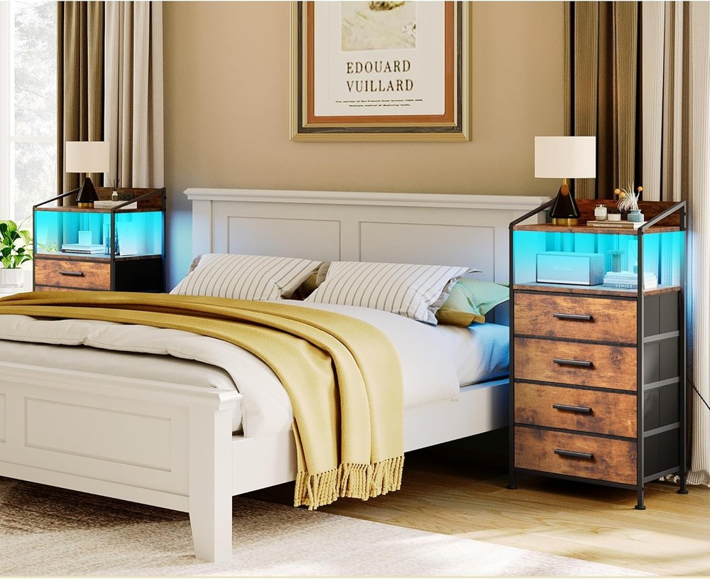Nightstand 11.4"D x 14.4"W x 32.5"H (4 Drawers), Rustic Brown Product Details Brand: EKNKOZY Product Dimensions: 11.4"D x 14.37"W x 32.5"H Color: Rustic Brown Room Type: Living Room Special Feature: Adjustable Feet MaterialFinish Type: Engineered WoodPolished Number of DrawersStyle: 44 Drawer Multi-scene Application: This dresser storage tower can used in multiple rooms, as a storage drawer table beside the couch; entryway table, console table, side table, display table in the living room. Dresser shelf or storage cabinet in the bedroom or nursery. Power Outlet & LED Lights: This nightstand features built-in LED lighting with 20 static colors, 22 dynamic modes, 10 speed grades and 5 brightness grades to create beautiful ambiance that enhances your room. The dresser is equipped with 2 Standard Plug Outlets & 2 USB Ports Charging Station, plug in your phones and lamps. Durable Material: Non-woven chest of drawer is breathable and can be wiped directly with a wet cloth. Solid MDF board with water-resistant design also easy to clean. Easy-to-pull metallic handle can smoothly open and close the drawer. Ample Storage: With 4 foldable fabric dresser drawers, each drawer can hold up to 10 lbs. Light weight and top handle makes it easy to move. Store all your articles for daily use. The double display shelf is perfect for keeping everyday essentials like lights, books, decorations, etc. within reach. Sturdy Structure: The tall vertical dresser anti-tipping accessories can protect you from any hurt. High-quality sturdy steel frame can provide stable support. Adjustable feet with plastic cover can protect your floor and are also suitable for uneven ground. Easy to Assemble: The night stand measures 11.4"D x14.4"W x 32.5"H. Clear manual, all screws, and tools are offered in the package. You can set up the whole drawer dresser easily by following the manual, and the uploaded assembly video is also for guidance. For any further support, please contact us.