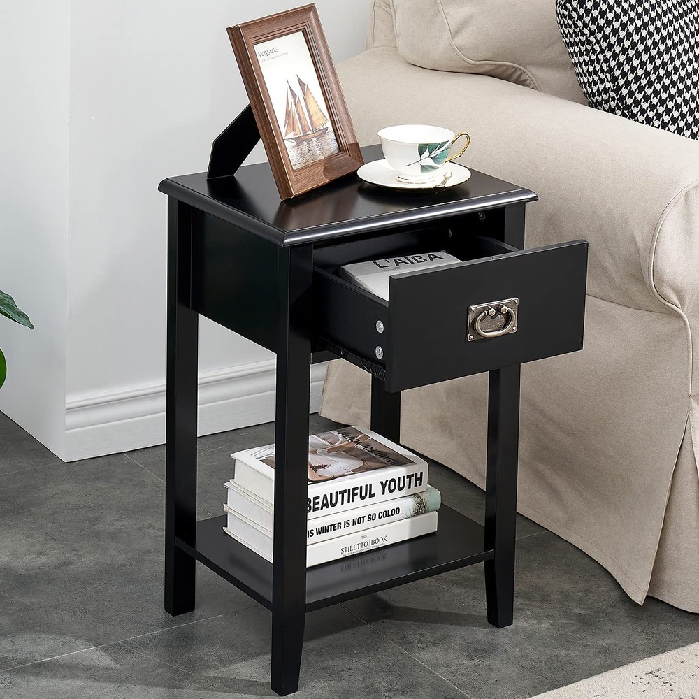 Material : Engineered Wood. No assembly required [Try Some New Chic] - New traditional end table with unmatched style is accented by sophisticated design for a bold elegant look. [Versatile] - The nightstand is perfectly fit next to your bed, sofa or set in the hallway. Add a fresh feeling to any room, ideal for any furniture, diverse home decoration and most interior style. [Ample Storage Space] - This nightstand inside and out is black painted for a complete look. Smooth running drawer provides sufficient storage space, round ring handle for easy pulled out. [Remarkable Durability] - Craft with E-1 grade high-quality MDF board and solid wood splicing. Waterproof & wearable top is easy to clean and ensure years of use.