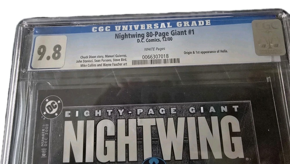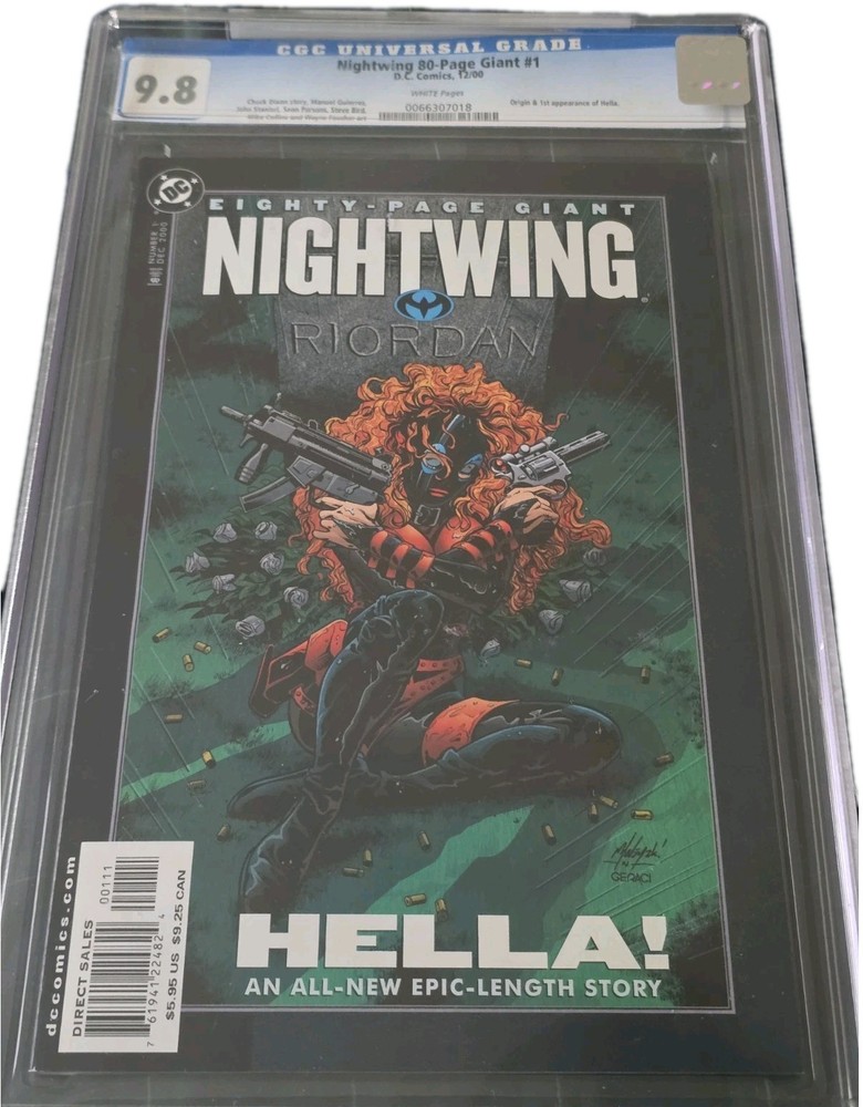 Nightwing #1 (2000, DC Comics) – CGC 9.8 | Key Issue | 80-Page Giant Graded: CGC 9.8 (Near Mint/Mint) Publisher: DC Comics Release Year: 2000 Story Title: “The Lepers” Key Issue Details: Story Overview: Nightwing #1 (2000) features the story “The Lepers,” exploring Dick Grayson’s dual life as Blüdhaven’s protector and Gotham’s prodigal son. This 80-page giant dives into his moral code, his ties to Batman, and the rise of a deadly new villain — Hella, appearing for the first time in DC continuity. Condition: Professionally graded CGC 9.8 – White Pages Case is clean, clear, and well-preserved Stored in a smoke-free, climate-controlled environment Why Collect: This issue is a must-have for fans of Nightwing, Batman Family, and 2000s DC key issues. With the first appearance of Hella and a strong origin focus, it’s a modern key that continues to gain interest among collectors. Shipping: Securely packed with bubble wrap and box protection International shipping available through eBay Global