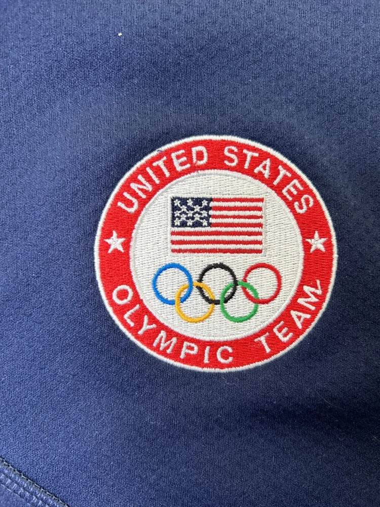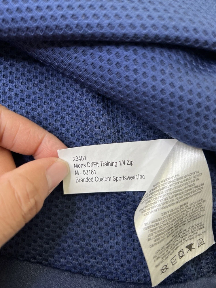 This Nike ACG Dri-Fit ADV pullover is a men's medium size with a half-zip closure and mock neck design. Featuring a USA Olympic Team graphic print and embroidered accents, this pullover is suitable for activewear during fall, winter, and spring seasons. The blue pullover is made of a blended fabric of polyester and wool, with thumb hole sleeves for added functionality. Perfect for activities like cycling, golf, cross-training, and running, this Nike Dri-FIT pullover embodies a patriotic USA theme with its design.