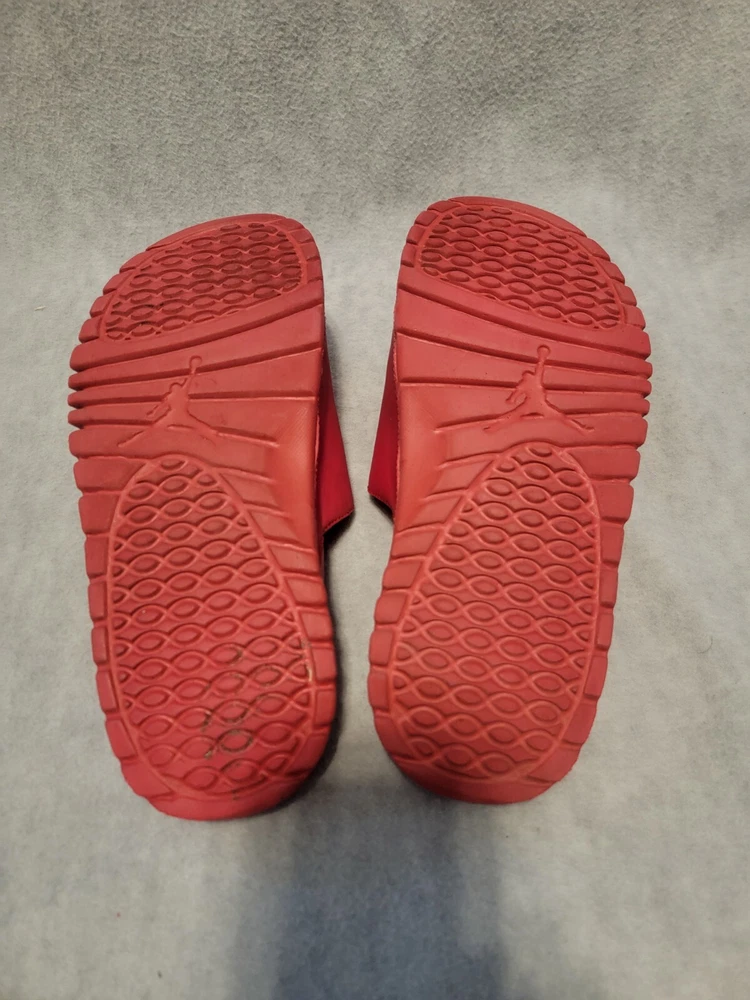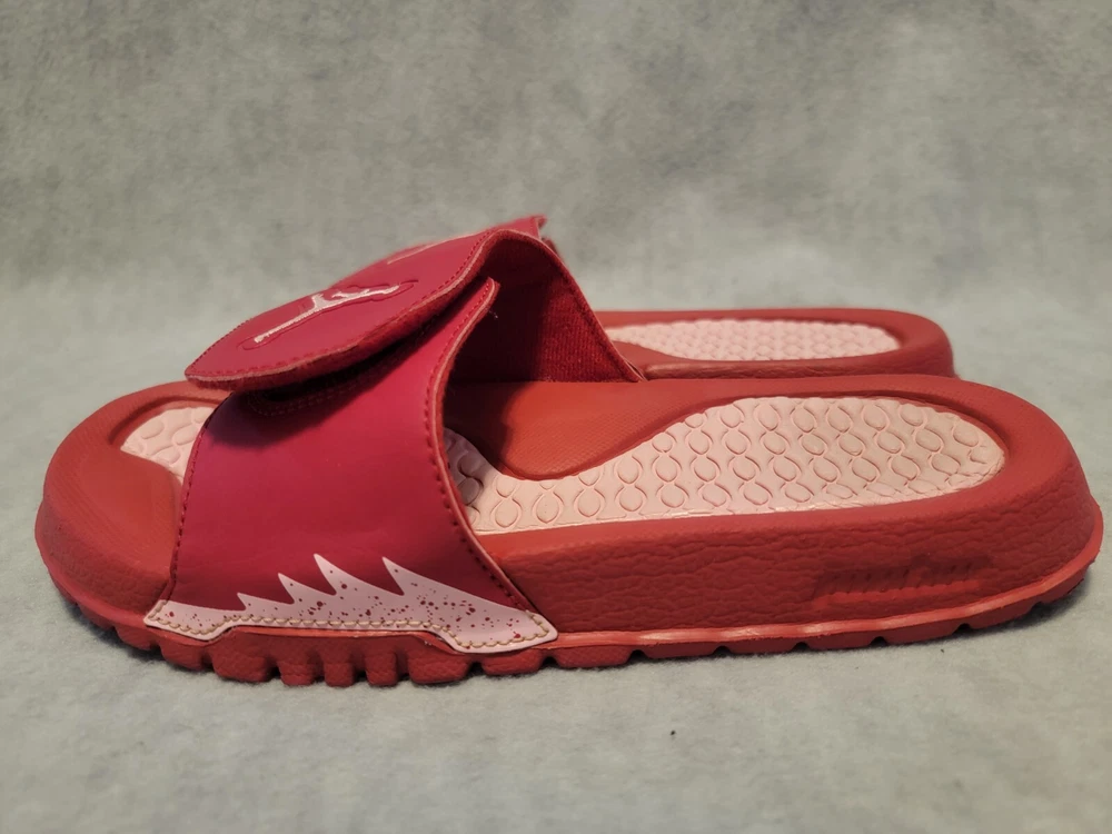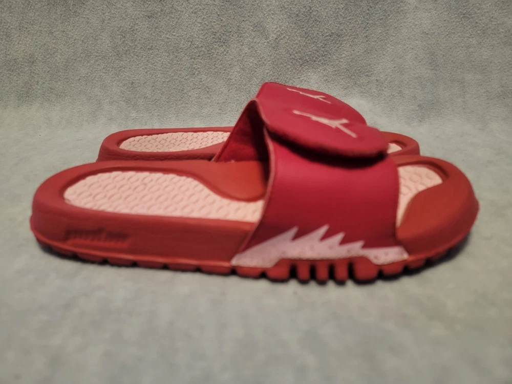 Elevate your summer footwear game with these vibrant red Nike Air Jordan Hydro V Retro 5 Sandals. Designed for unisex kids, these slides feature an adjustable strap and hook & loop closure for easy wear. The flat rubber sole provides a comfortable fit, perfect for beach days or school events. These slides are inspired by the iconic Air Jordan 5 model and are a must-have for any sneakerhead. With their athletic and leisurely design, these slides are versatile enough to wear to the beach or a basketball game. VERY CLRAN