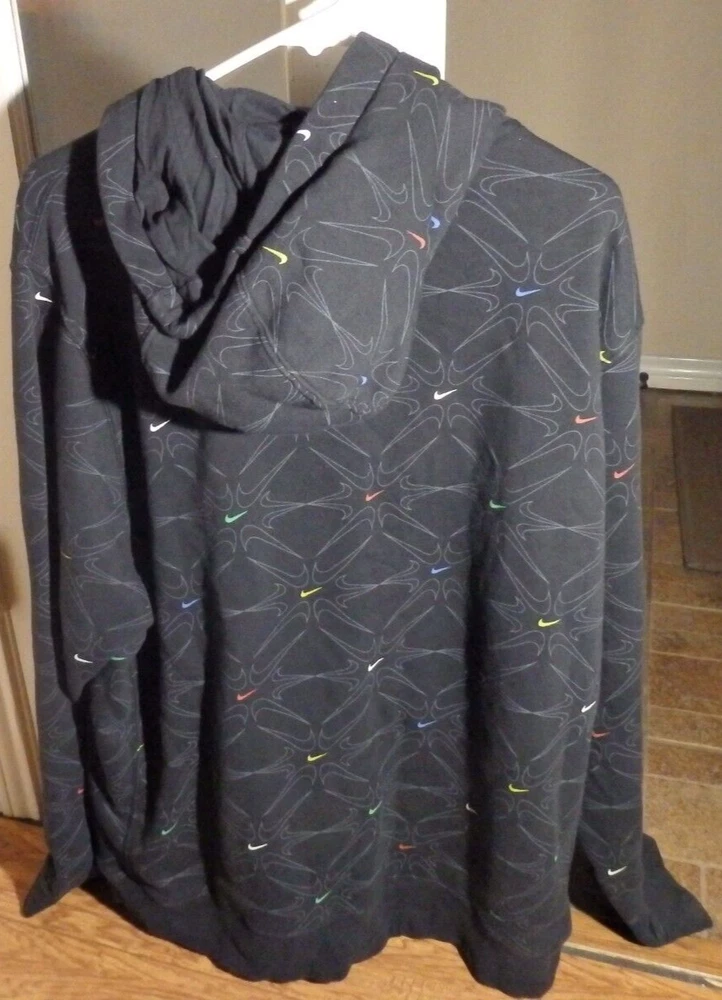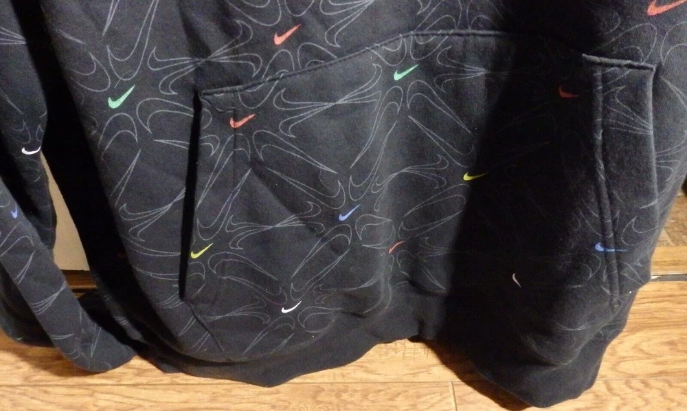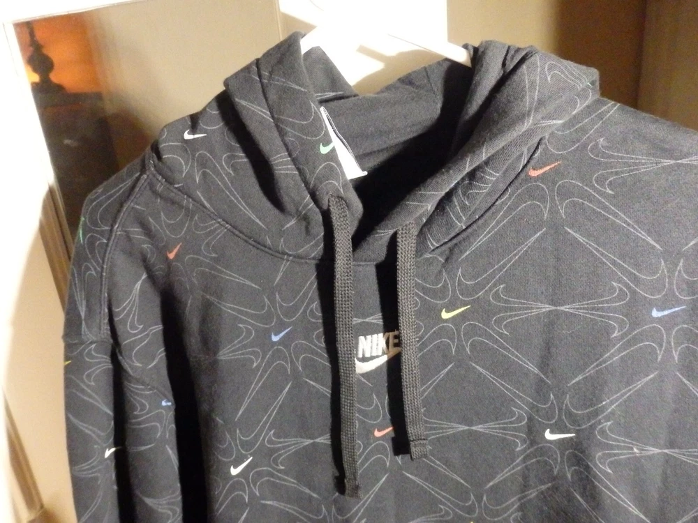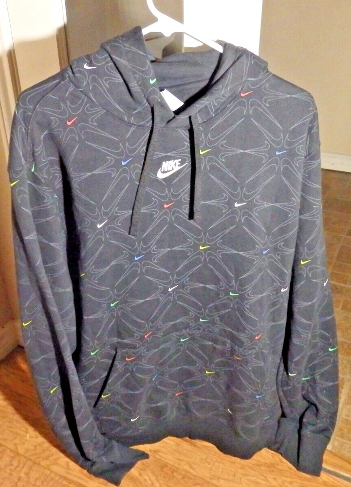 This Nike AOP Gel Fleece Pullover Hoodie in size XL is a must-have for any sports enthusiast. The hoodie features a solid black color with an embroidered Nike logo on the front. It has long sleeves with drawstring closure and a hooded design with pockets for added convenience. Made of a cotton blend fleece material, this hoodie is perfect for all seasons and activities such as gym training, walking, and basketball. The American Front Middle Swoosh theme adds a touch of sportiness to the hoodie, making it a great addition to any Nike Sportswear collection. The hoodie is in good condition as pictured. It has a very attractive design and looks to be very comfortable. I offer fast, low-cost shipping on this item. Please check out my page for other great items and collectibles including other clothing items and shoes. I am happy to combine shipping on a several item purchase.
