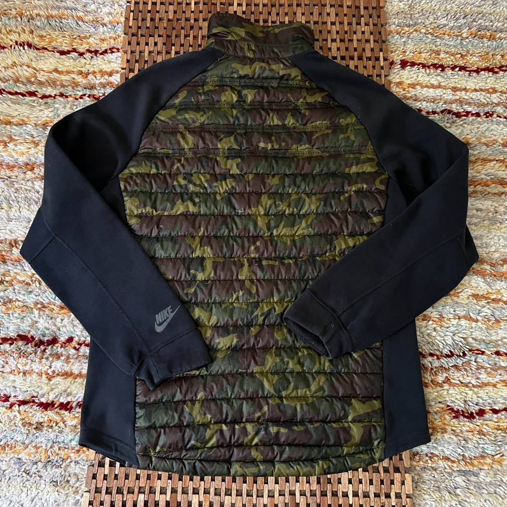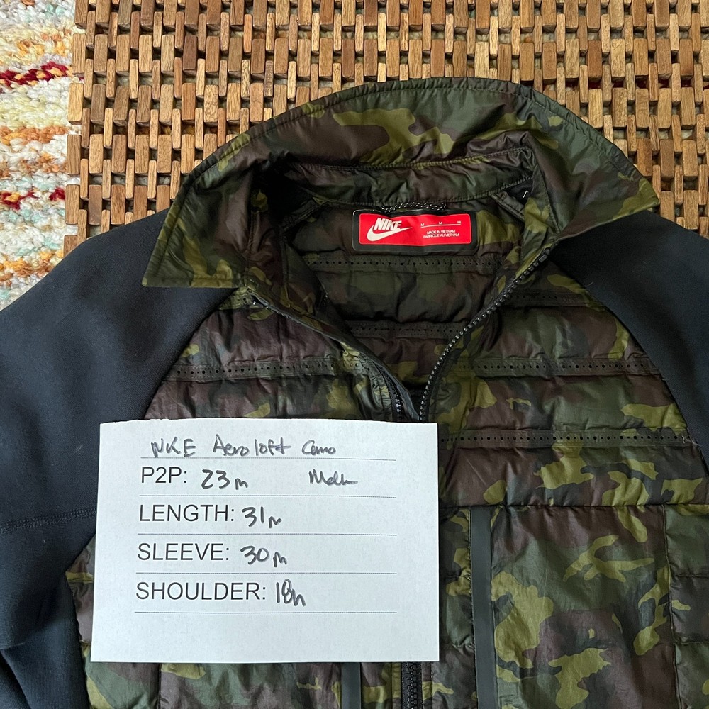 The Nike Aeroloft 800 Goose Down Ultralight Camo Puffer Jacket in Green Black Medium is a stylish and functional winter jacket designed for men. Made with a polyester outer shell and lined with polyester, this mid-length jacket features a zip closure, making it easy to put on and take off. The 800 warmth weight is provided by goose down insulation, keeping you warm and comfortable in cold weather. This puffer jacket by Nike is a great choice for casual occasions, with a colorful camo design and logo accents adding a touch of style. Additionally, the jacket is machine washable for easy care.