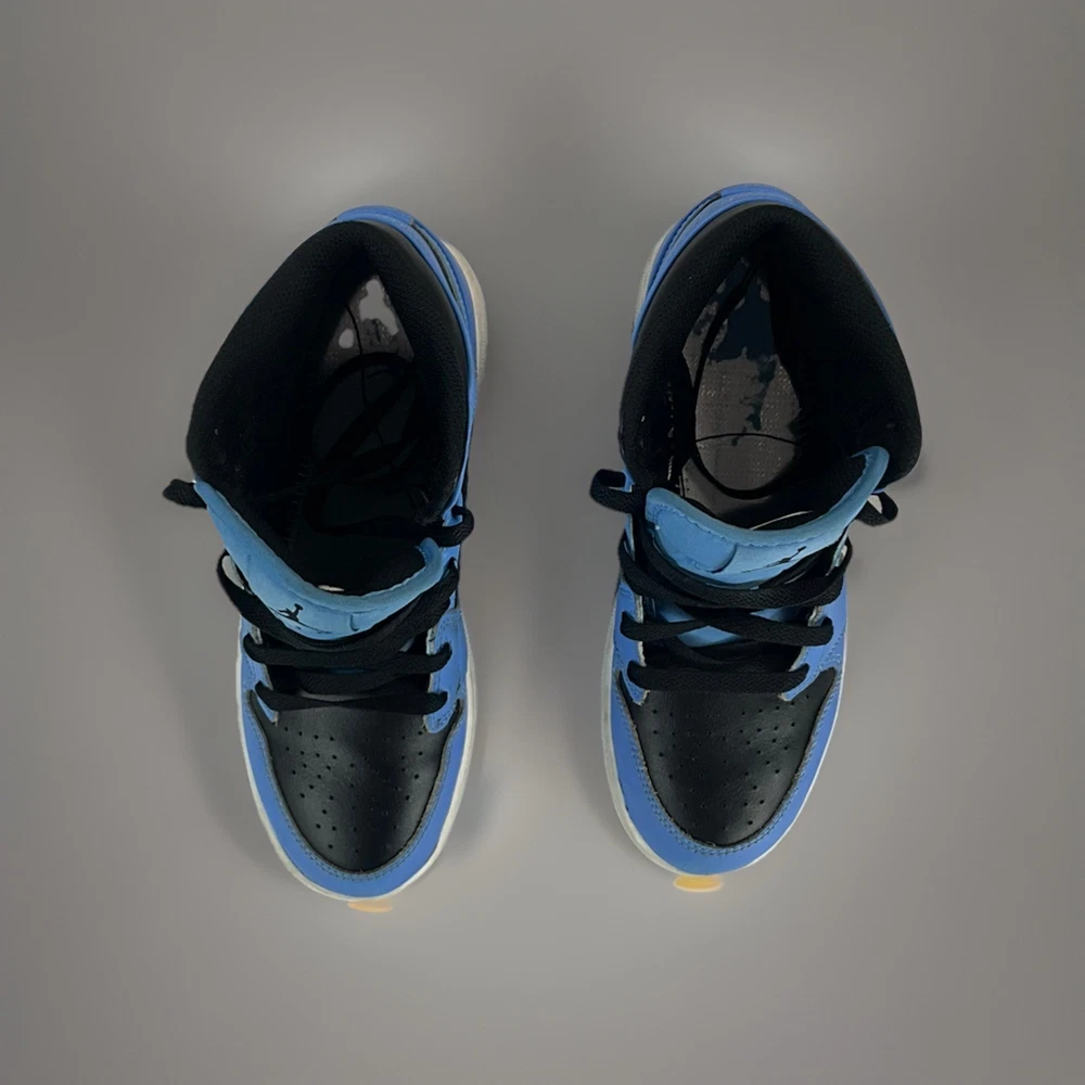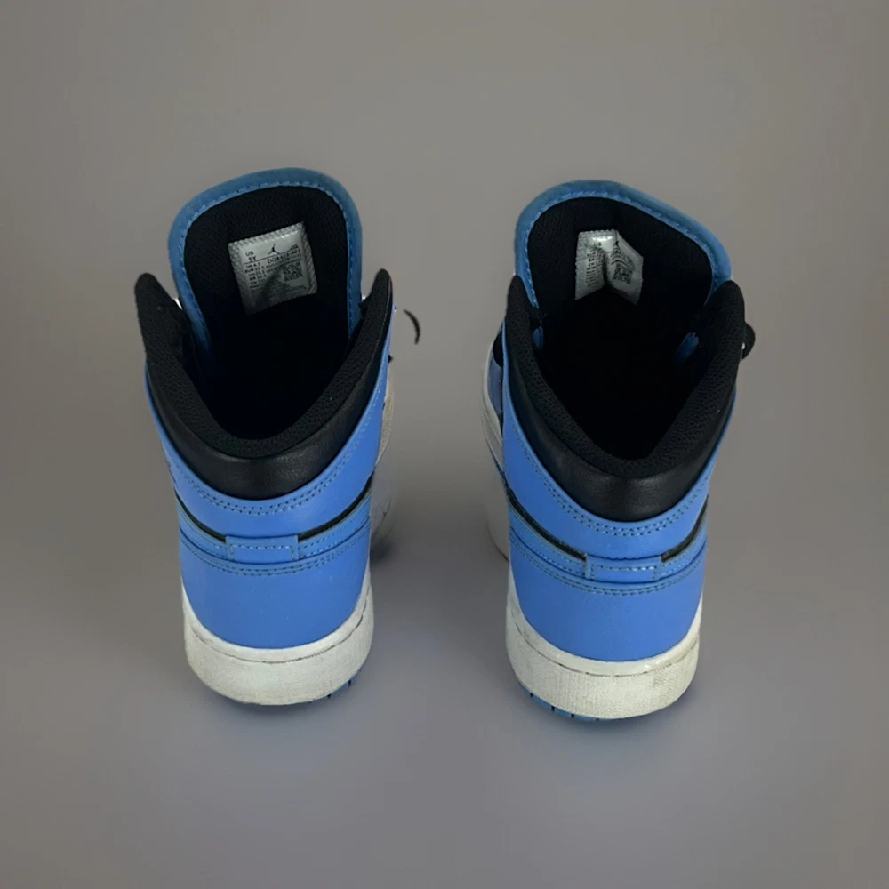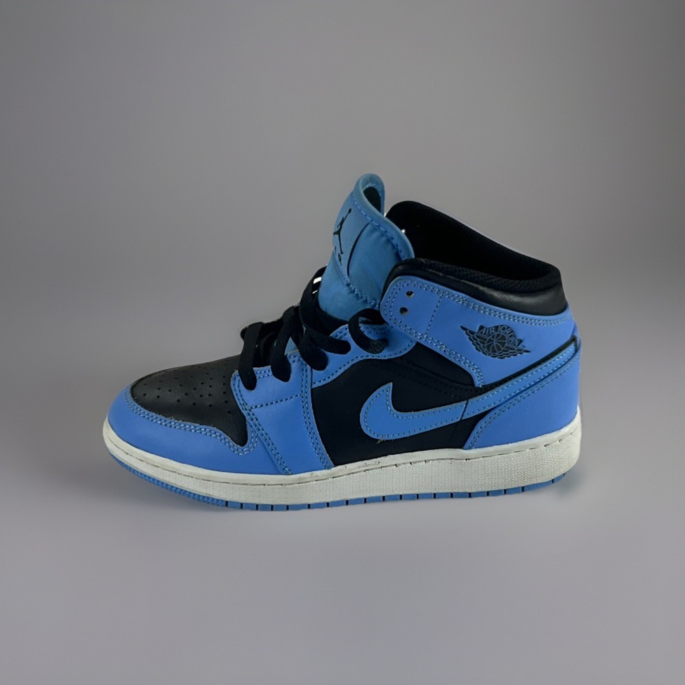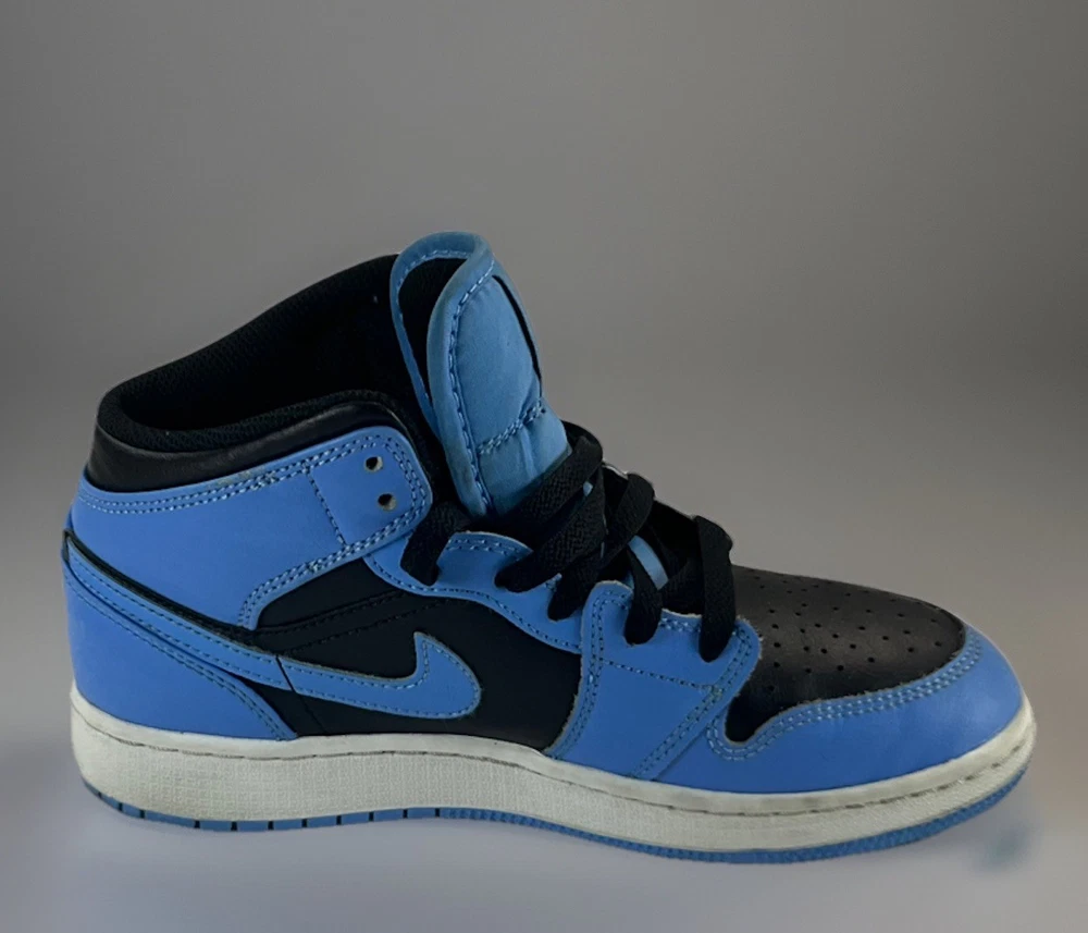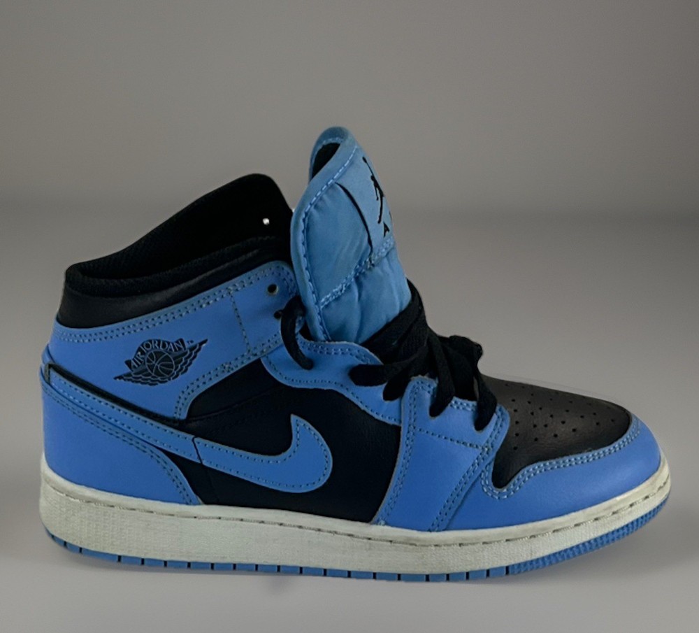 The Nike Air Jordan 1 Mid University Blue Black DQ8423-401 Youth Size 5Y is a stylish and comfortable sneaker designed for boys. With a lace-up closure and mid-top shoe shaft style, these sneakers feature a colorblock pattern in blue with the iconic Jordan character. Made with leather upper material and a rubber outsole, these athletic shoes are perfect for travel, activewear, and casual occasions. Additionally, the Air Jordan 1 Mid model offers adjustable features and is part of the Nike Air product line, making it a great choice for gym & training, walking, and school activities.