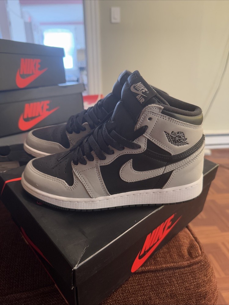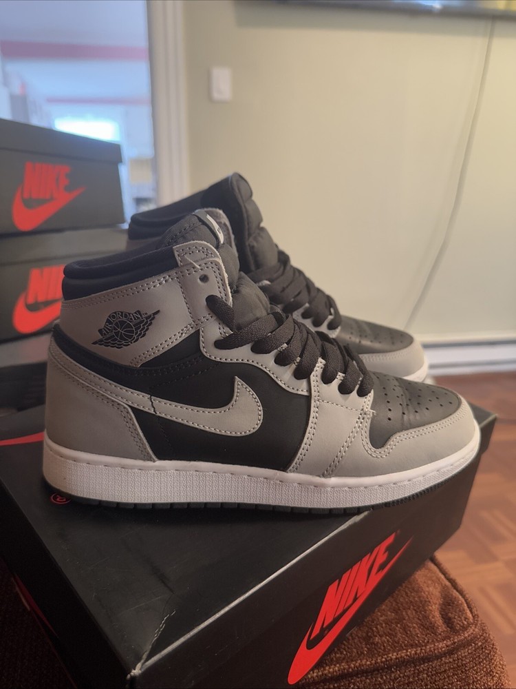 These Nike Air Jordan 1 Retro High Shadows are in flawless condition—barely worn and well-maintained. The GS size 5.5 fits perfectly, and the classic Shadow colorway goes with everything. Super clean, just like the pics show! A must-have for any sneakerhead.