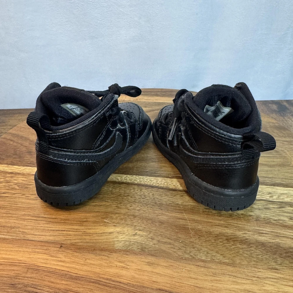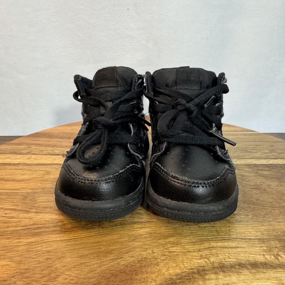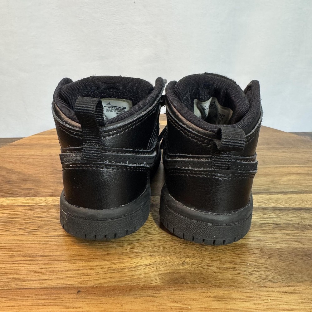 Brand: Jordan (Nike Air Jordan line) Model: Air Jordan 1 Retro High toddler athletic shoes with classic high-top basketball silhouette. Color: All black leather upper with black Swoosh overlays, black Wings logo on collar, black midsole and outsole, and black laces. Gender/Size: Boys Toddler; size on tag: US 5C, UK 4.5, EUR 21, cm 11, BR 20, CN 110(2.5). Style/Model code: 640735-090 (as shown on inner tag). UPC: 00192499700506 (printed near barcode on inner tag). Country of origin: Made in Vietnam; production dates listed as 02/20/19 to 04/17/19 on interior tag. Materials: Leather upper, soft fabric lining, and durable rubber outsole. Details: Lace-up closure for secure fit, padded tongue and collar for comfort, perforated toe box for breathability, pull tab at heel for easy on/off, and solid rubber cupsole with circular traction pattern for grip.