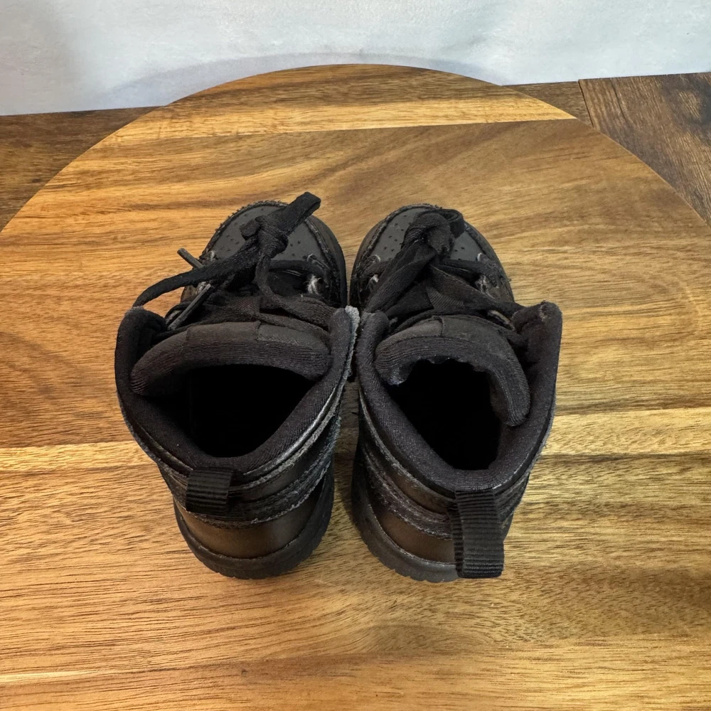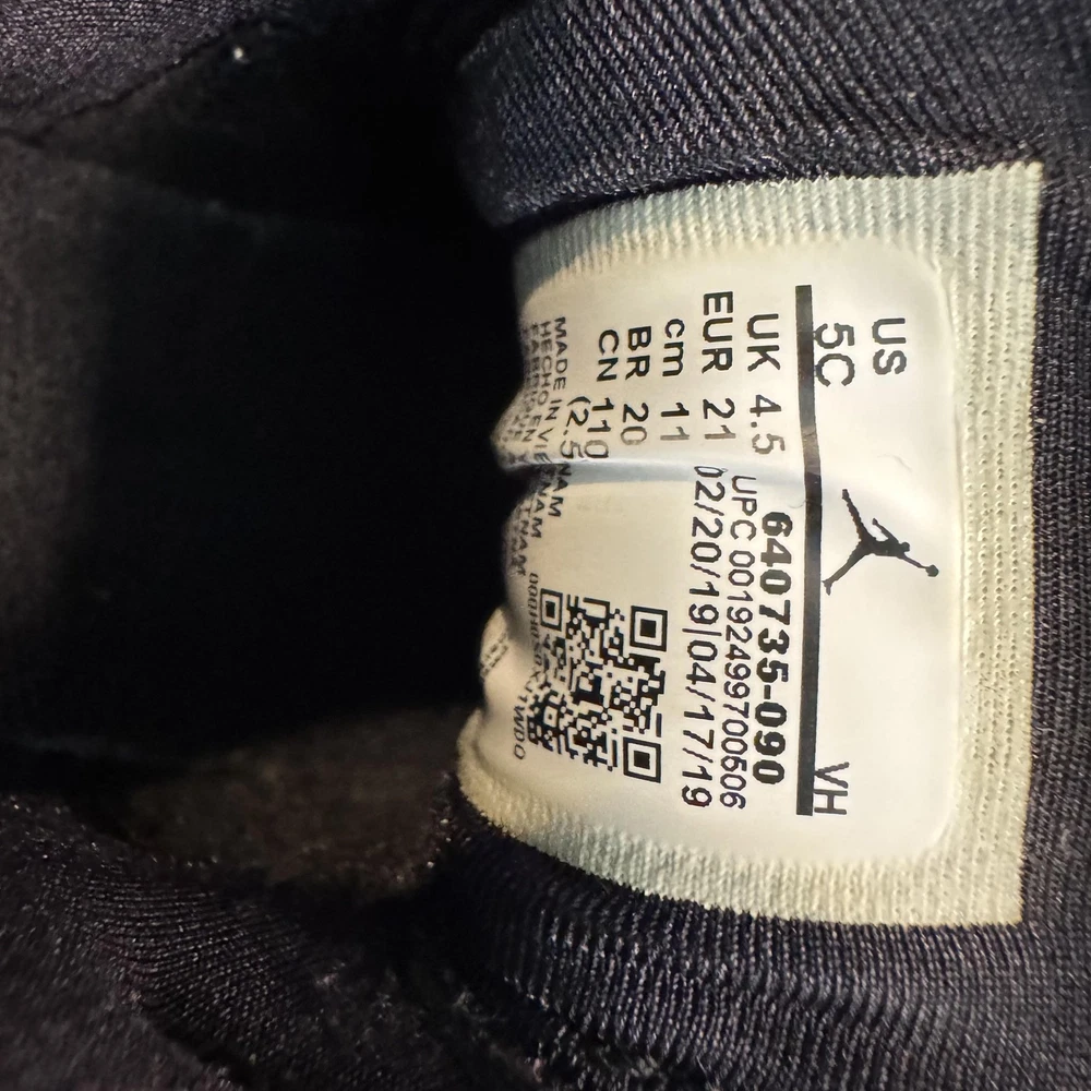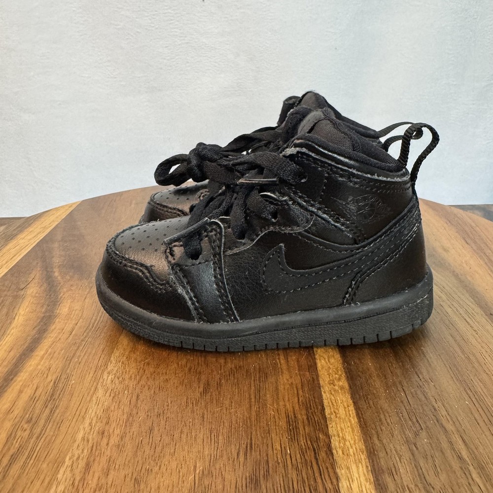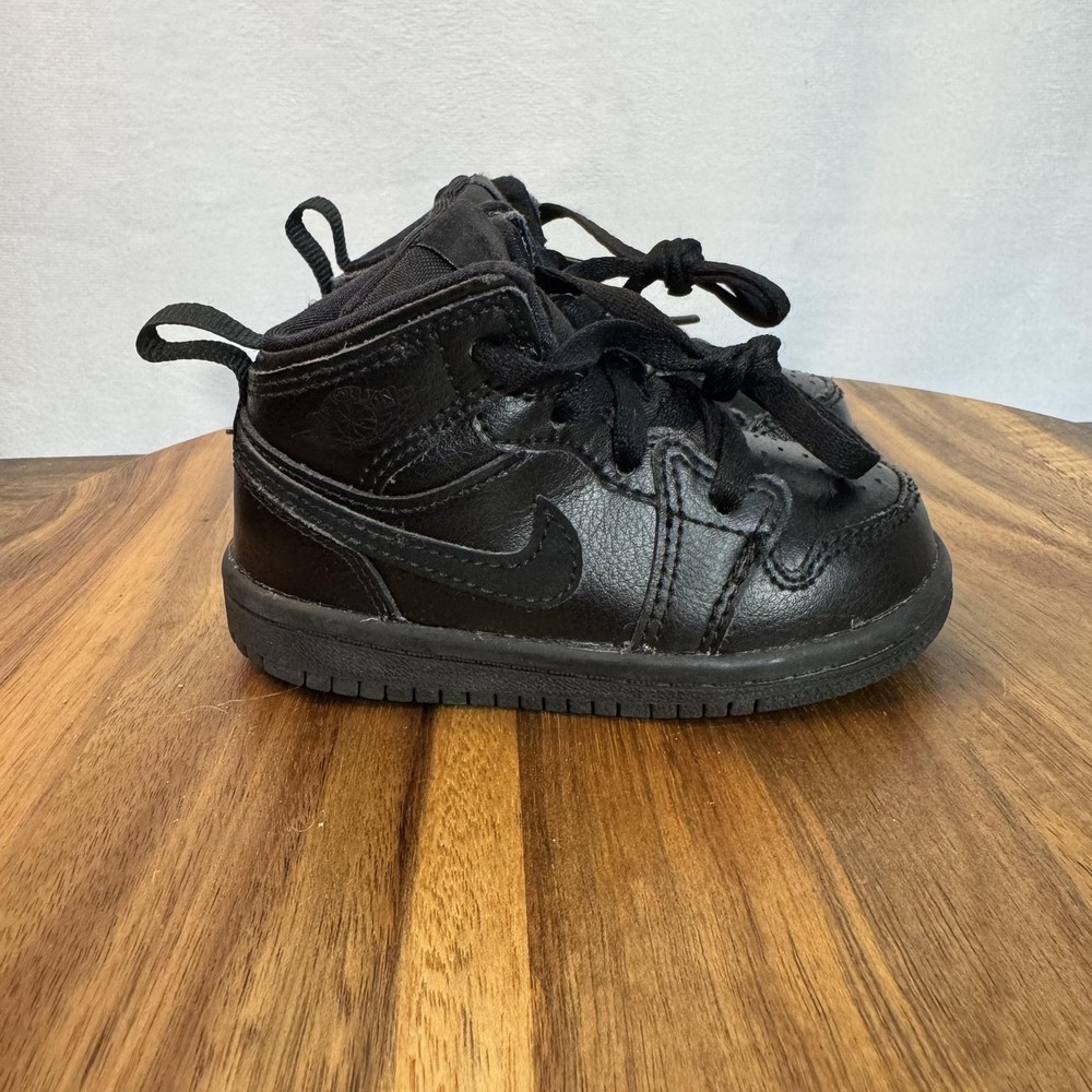 Brand: Jordan (Nike Air Jordan line) Model: Air Jordan 1 Retro High toddler athletic shoes with classic high-top basketball silhouette. Color: All black leather upper with black Swoosh overlays, black Wings logo on collar, black midsole and outsole, and black laces. Gender/Size: Boys Toddler; size on tag: US 5C, UK 4.5, EUR 21, cm 11, BR 20, CN 110(2.5). Style/Model code: 640735-090 (as shown on inner tag). UPC: 00192499700506 (printed near barcode on inner tag). Country of origin: Made in Vietnam; production dates listed as 02/20/19 to 04/17/19 on interior tag. Materials: Leather upper, soft fabric lining, and durable rubber outsole. Details: Lace-up closure for secure fit, padded tongue and collar for comfort, perforated toe box for breathability, pull tab at heel for easy on/off, and solid rubber cupsole with circular traction pattern for grip.