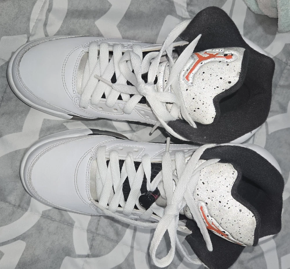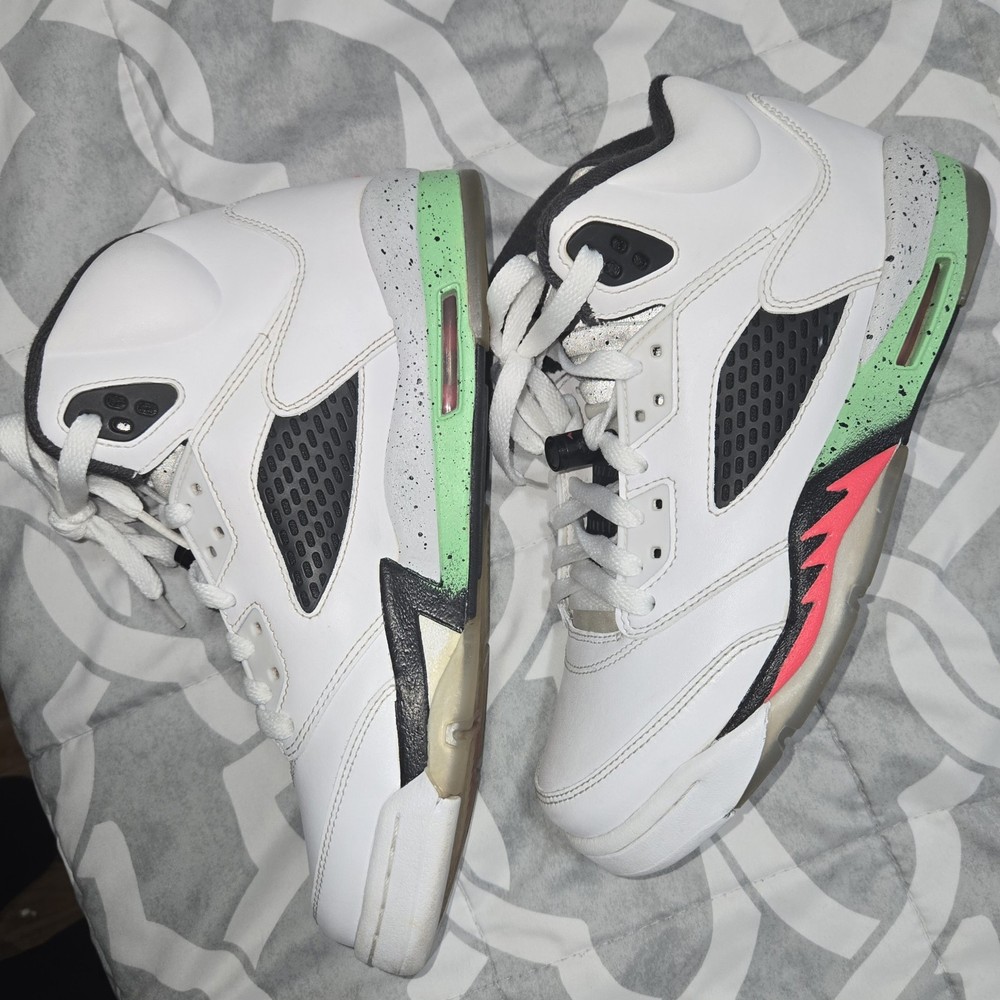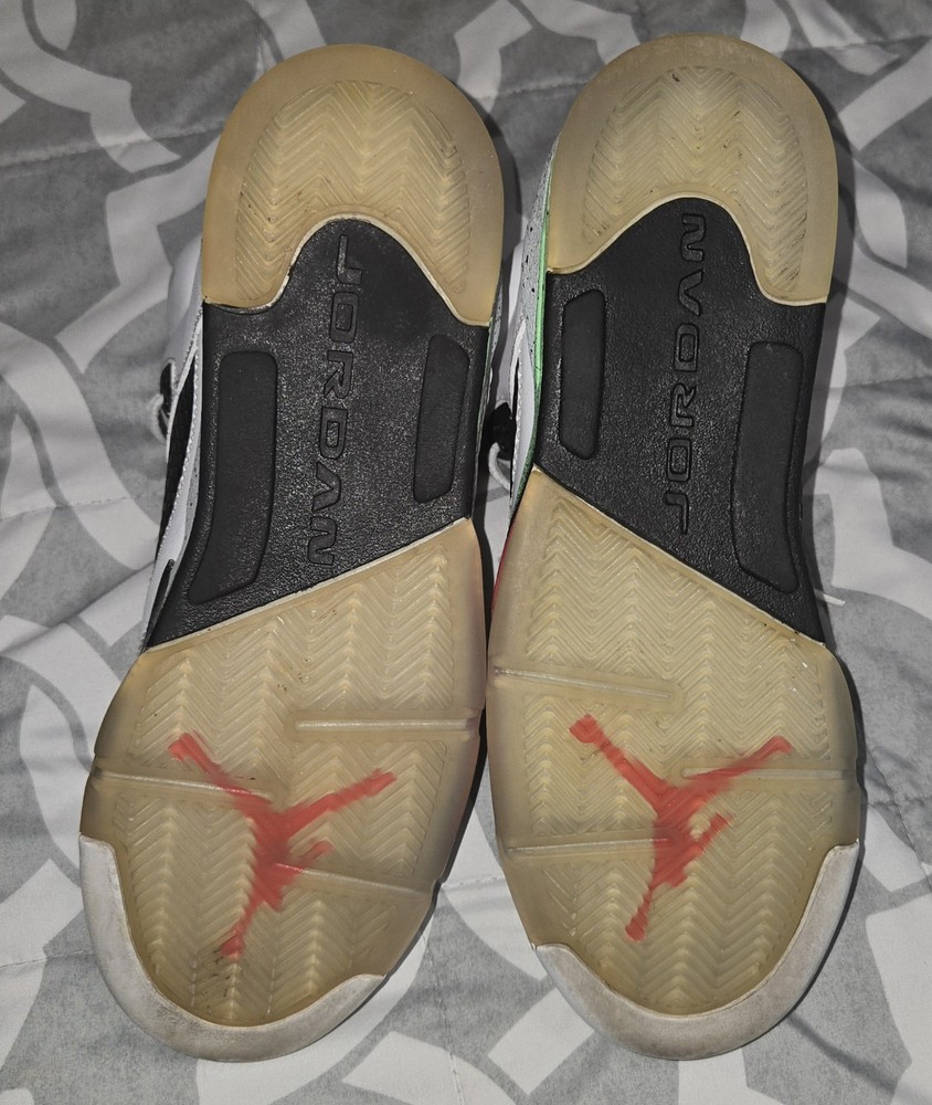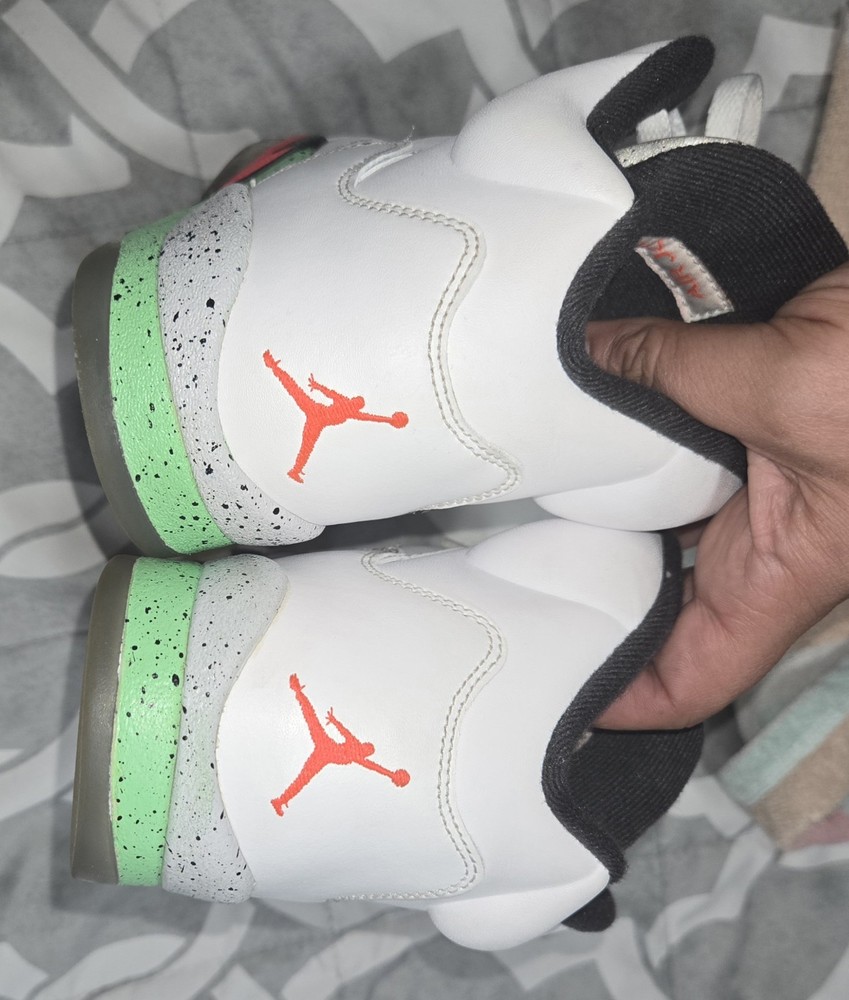 The Nike Air Jordan 5 Retro "Poison Green" Shoes in Youth Size 6.5Y are stylish athletic sneakers designed for active kids. Featuring a lace-up closure and moderate cushioning level, these shoes offer comfort and support for various activities, such as basketball. The white color with logo accents and retro theme make them a trendy choice for both boys and girls. Made with a leather upper, blended fabric lining, and rubber outsole, these shoes are durable and suitable for summer, fall, and spring seasons. Perfect for on-the-go kids who want to look good while staying active.