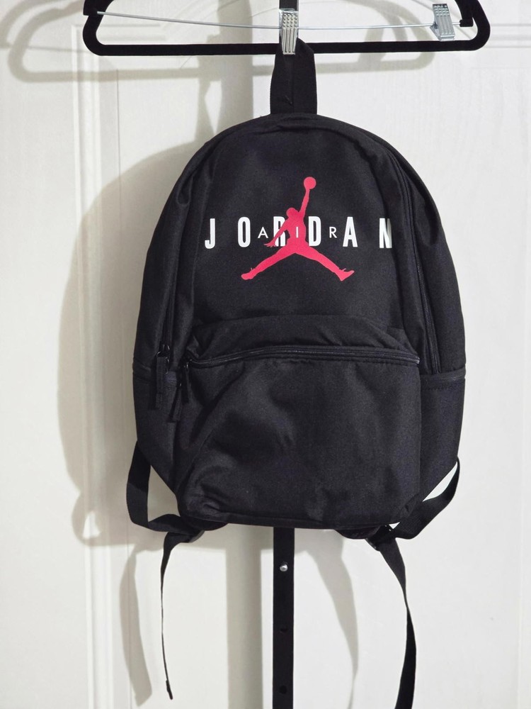 Brand New with tags. Nike Air Jordan Classic Black Backpack Red Jumpman logo. Offically licensed Air Jordan backpack in sleek black featuring the iconic red jumpman logo. Durable, stylish, and spacious, this backpack includes a padded laptop sleeve inside, roomy front zip pocket, and adjustable padded straps for all-day comfort.