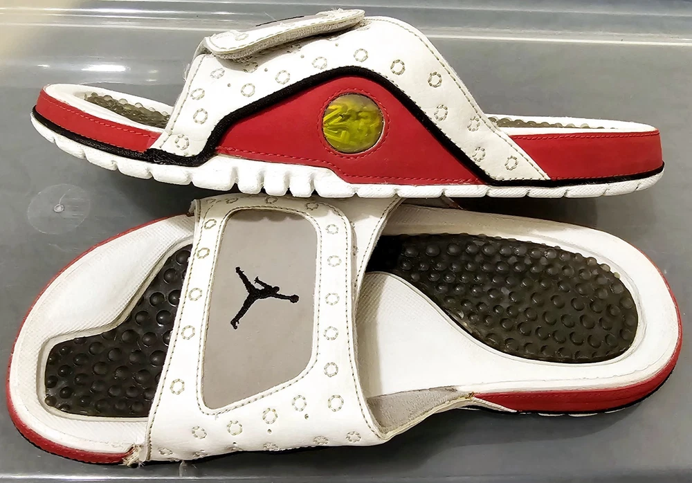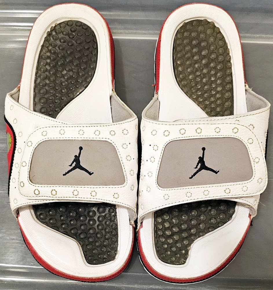 The NIKE AIR JORDAN HYDRO XIII 13 RETRO Men's Slides in White/Red are a highly sought-after and rare pair of sandals featuring the iconic Jordan Jumpman logo. These slip-on slides are perfect for casual or activewear occasions, with a solid pattern and adjustable strap for a comfortable fit. Made with synthetic material and a rubber insole, these retro-themed slides are a stylish addition to any slide collection, combining the classic Air Jordan product line with a modern twist on the slide style.