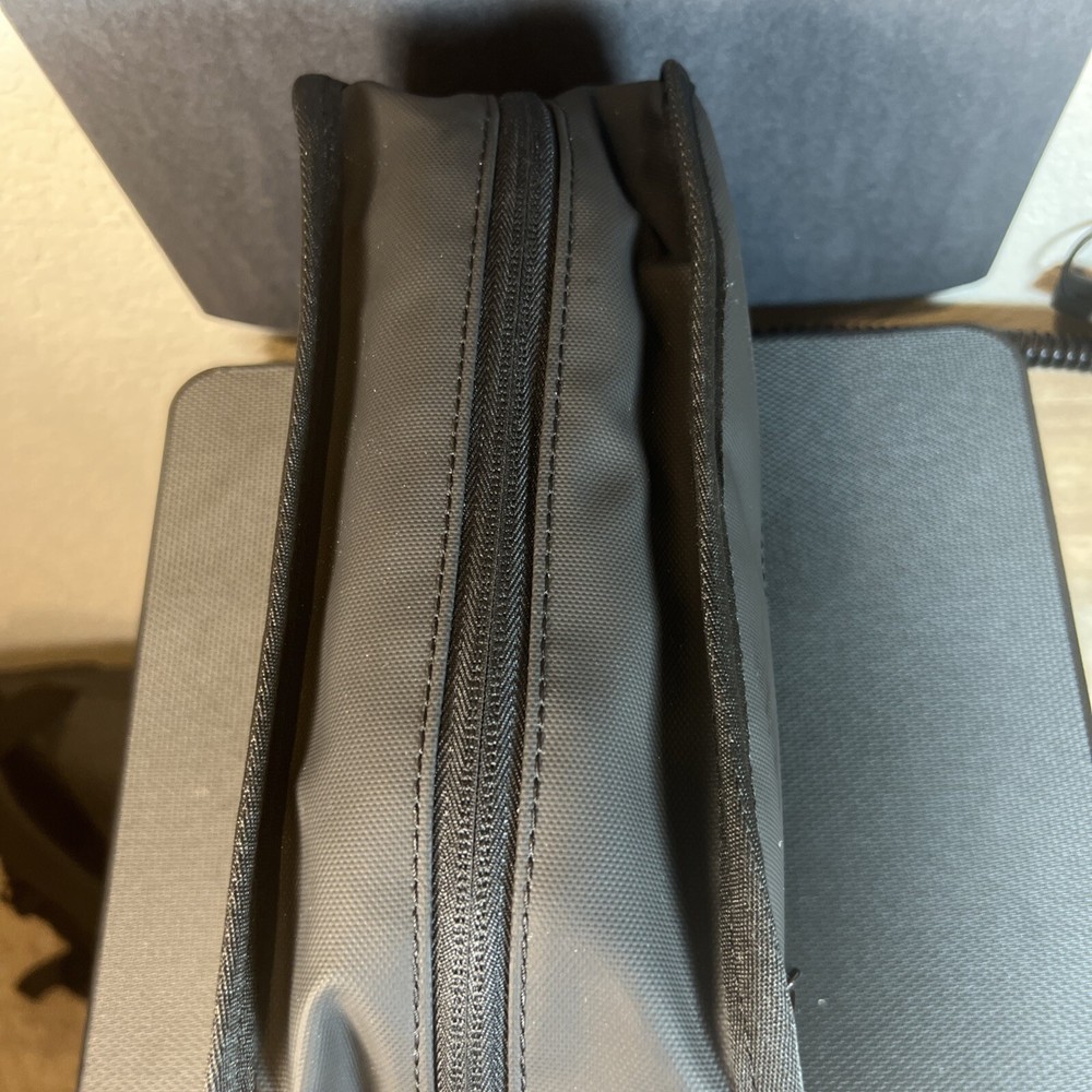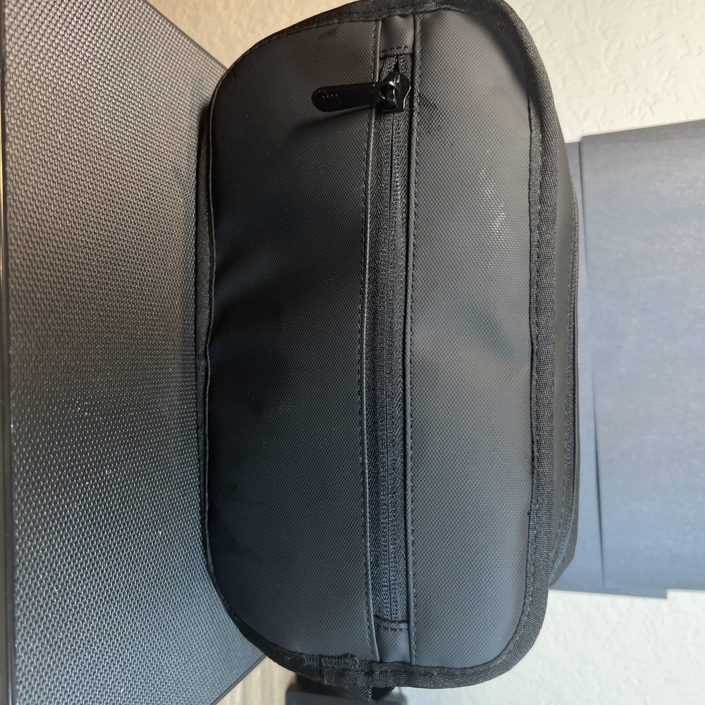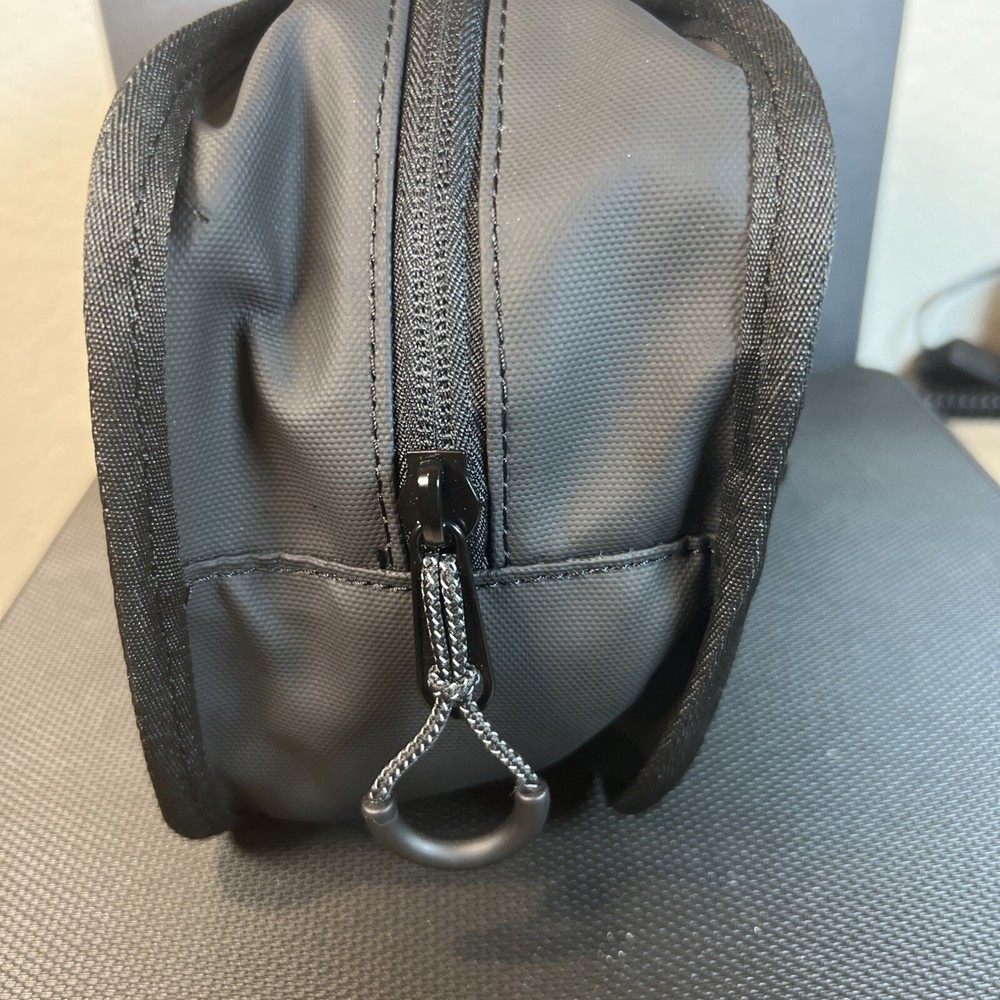 The Nike Air Jordan Men's Travel Dopp Kit Clutch Toiletries Bag in Black/White is a small polyester bag designed for travel, casual, or business use. Featuring a zip closure, top handle, and a zip-around design, this clutch-style bag is ideal for storing toiletries and other small essentials. Small blemishes on front, see photos.