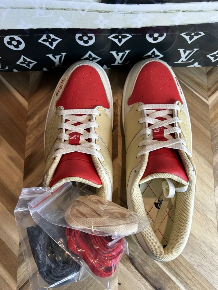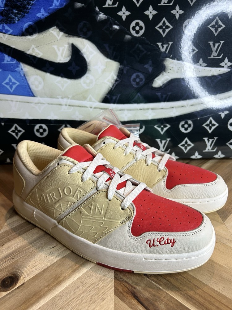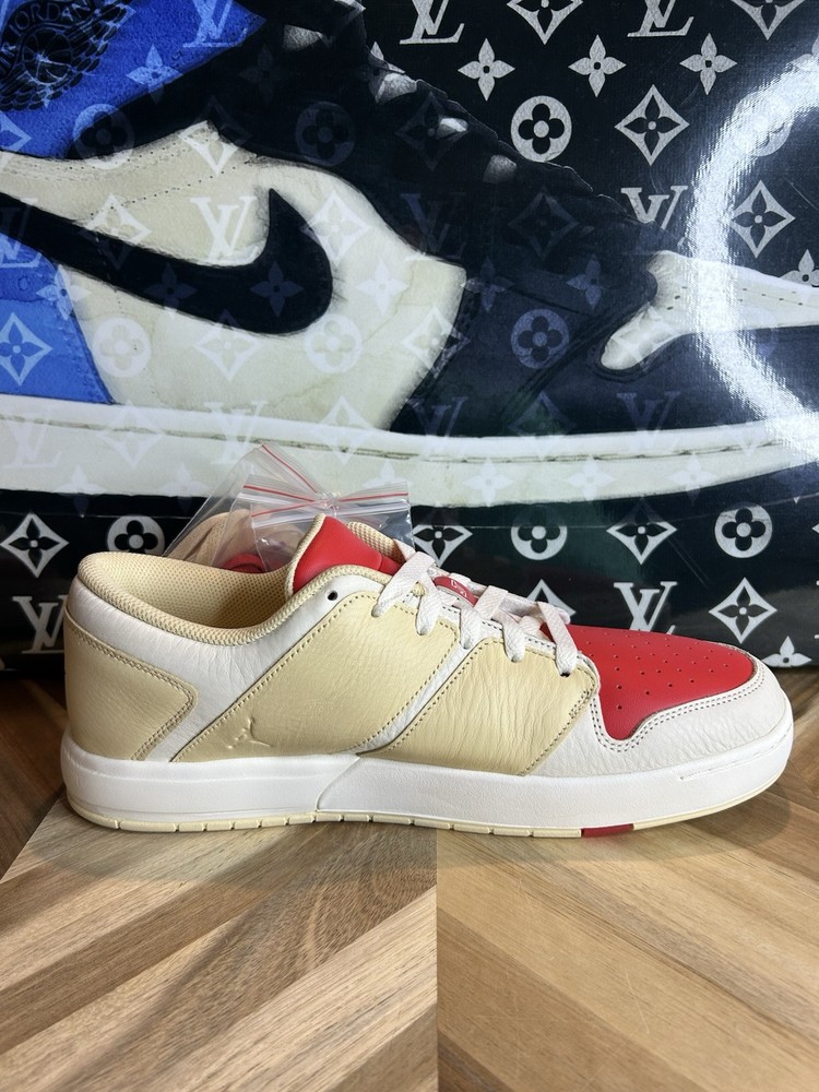 Elevate your sneaker game with these Nike Air Jordan Nu Retro 1 Low x Jayson Tatum PE shoes. The ivory and red leather upper material is complemented by the cushioned insole and foam outsole for maximum comfort during walking or basketball. These athletic shoes are perfect for both casual and activewear occasions, and their lace-up closure ensures a secure fit. The Jordan 1 Low Red silhouette adds a touch of style to these sneakers, making them suitable for all seasons. With a standard shoe width and a US shoe size of 12, these shoes are a rare find for sneaker collectors and enthusiasts alike. The shoes are part of the Jordan product line and are manufactured in Vietnam.