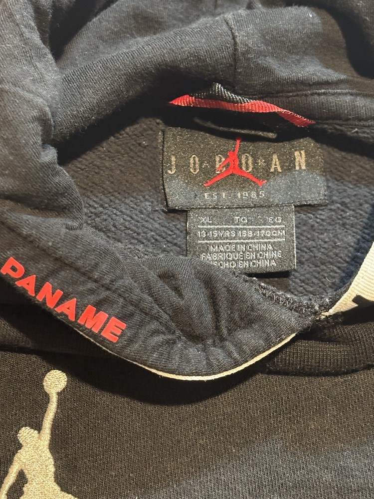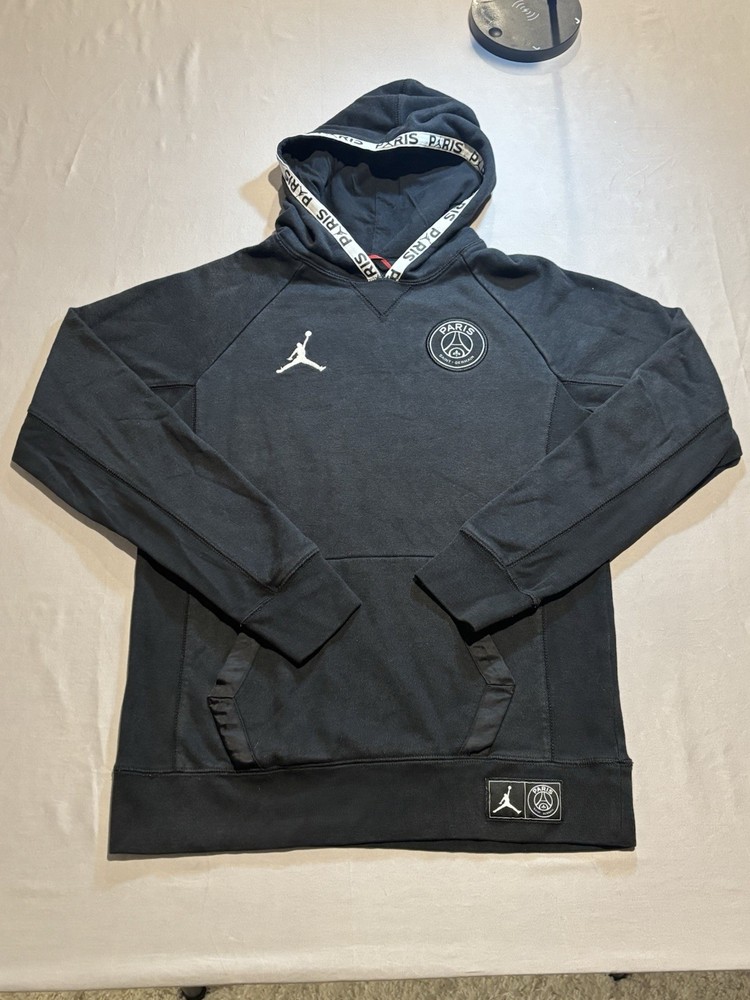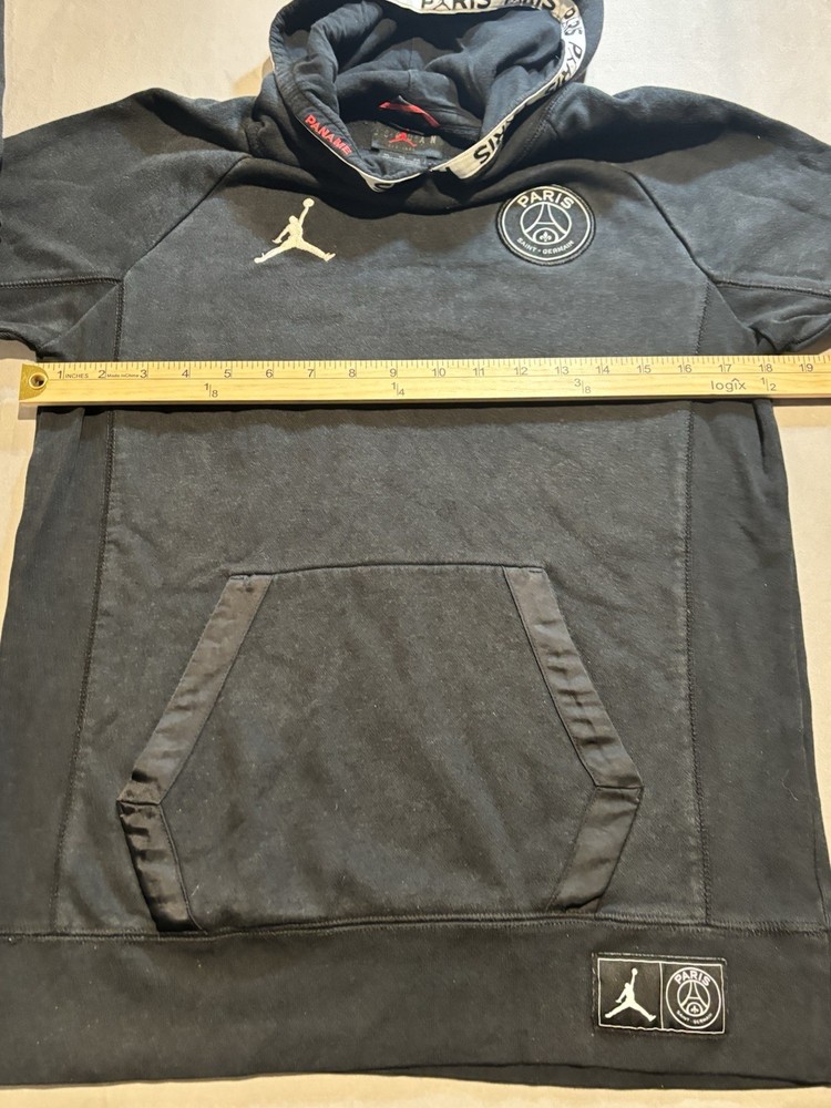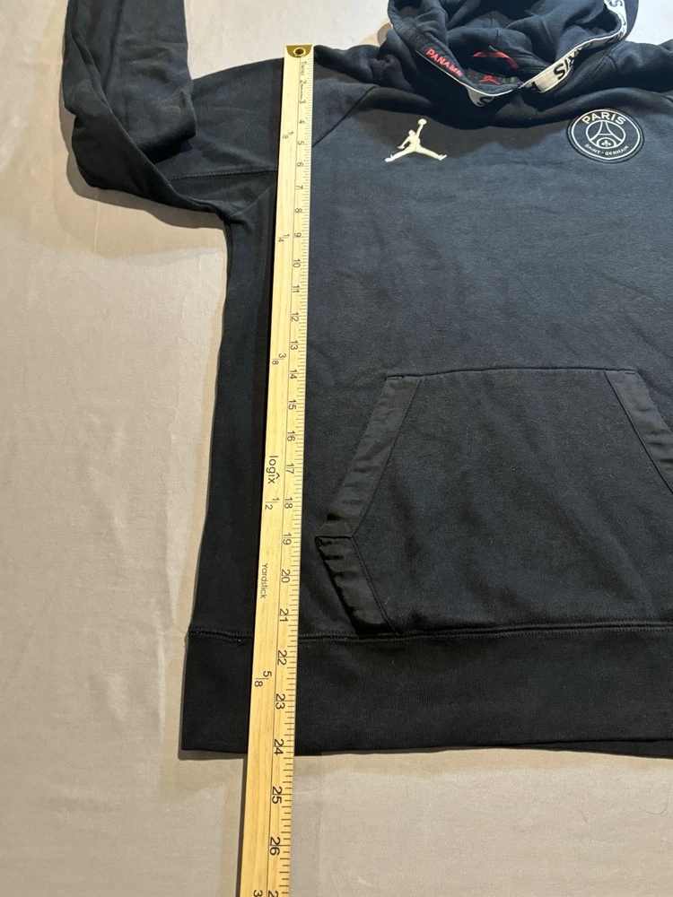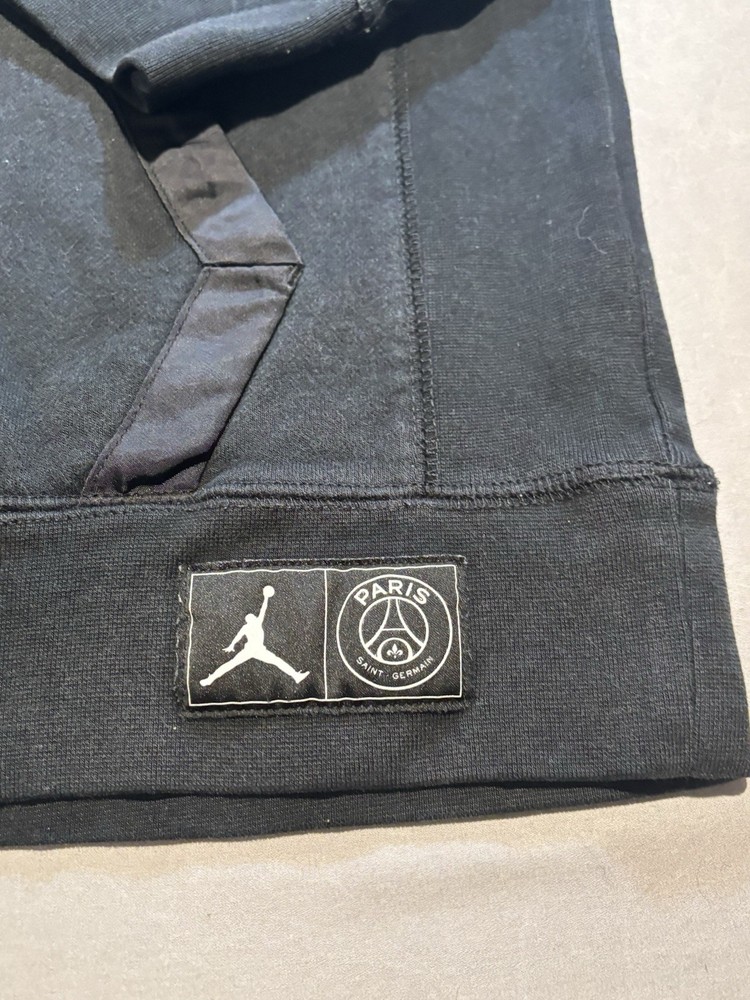 The Nike Air Jordan x PSG Paris Saint-Germain Boys Hoodie in XL size (13-15Y) is a stylish black hoodie featuring the iconic Paris Saint-Germain logo. Made from cozy fleece fabric, this pullover hoodie is perfect for casual occasions and includes a hood for added warmth. Suitable for winter, fall, and spring seasons, this hoodie is ideal for basketball performance and everyday wear, showcasing the combination of Nike Air and Jordan brands in a single garment for young boys. Machine washable for easy care, this hoodie is a versatile and fashionable addition to any boy's wardrobe.