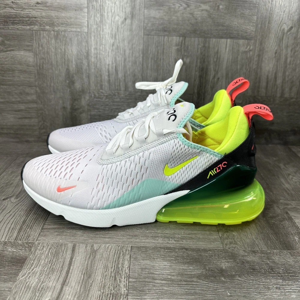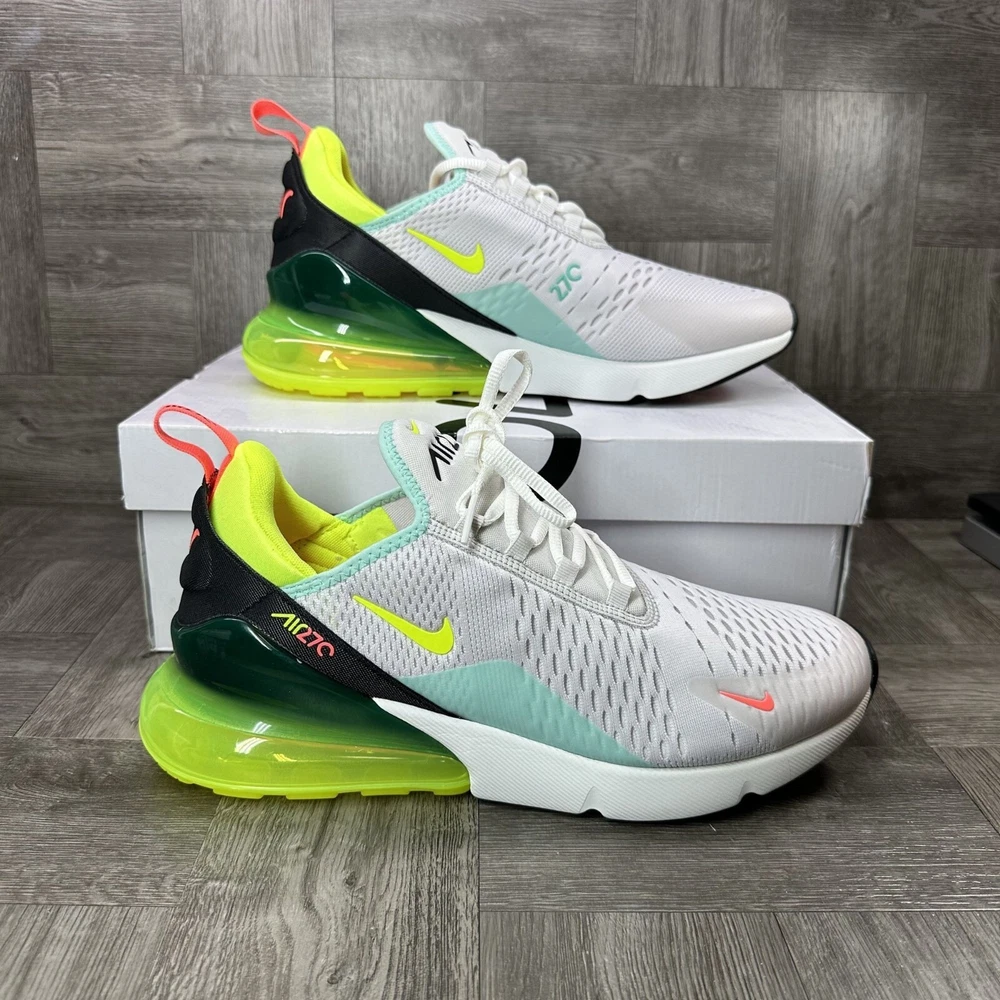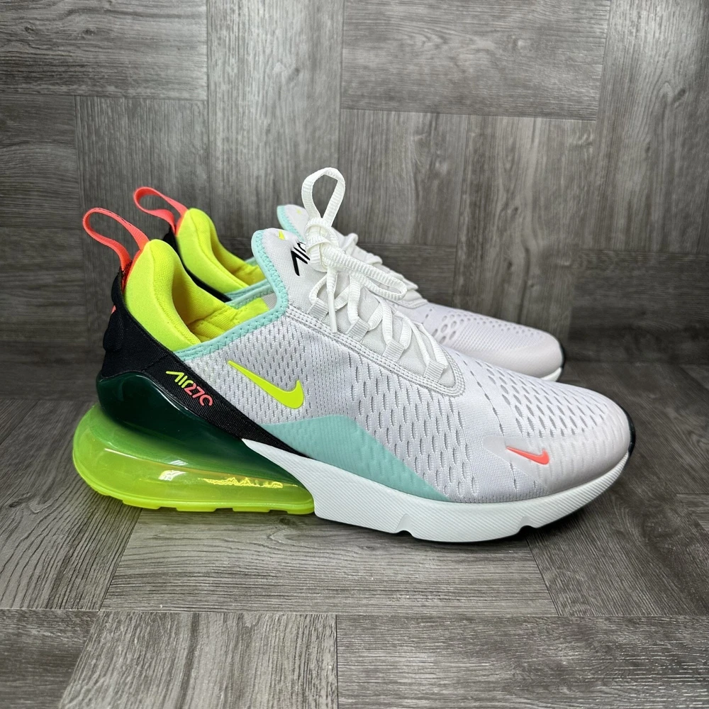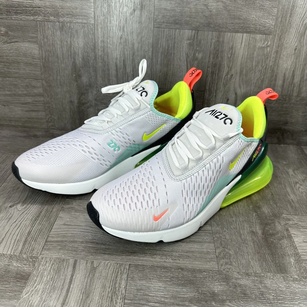 Elevate your athletic experience with the Nike Air Max 270, model FZ4132-001, a top-tier choice for men seeking both style and performance. The sleek white colorway, paired with vibrant volt accents, offers a versatile look that can power through your workout sessions or complement your casual outings. The breathable mesh upper and foam insole materials ensure comfort and support, while the durable rubber cleats provide excellent traction. Available in US size 10.5 and equivalent sizes for the UK (9.5) and EU (44.5), these sneakers are designed for a snug, yet comfortable fit with a standard shoe width. Crafted in Vietnam, the shoe's solid pattern and low-top shaft style make it a modern addition to any ensemble, reflecting Nike's commitment to innovation and design in every detail.