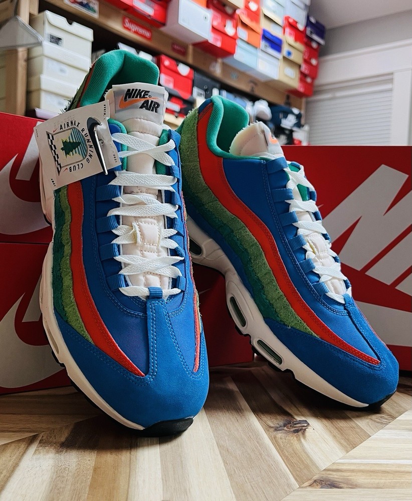 Nike Air Max 95 SE "Running Club" CPFM in size 12 features a multicolor design with Photo Blue and Roma Green accents. This limited edition sneaker, part of the Nike Air Max line, showcases a low-top silhouette with suede upper material, lace-up closure, and rubber outsole. The design is influenced by various themes such as USA, celebrity, college, and classic, making it a standout choice for those seeking comfort and performance in their athletic shoes.