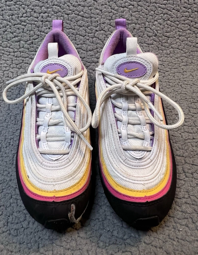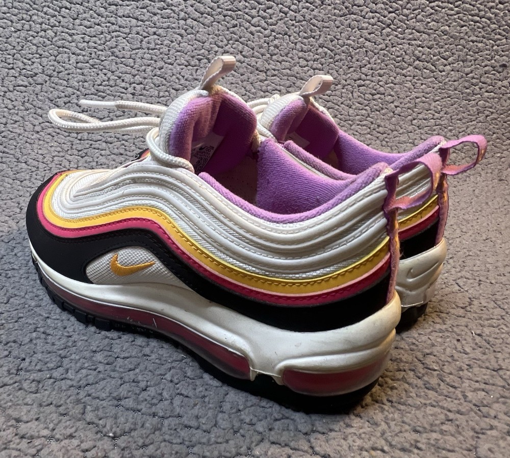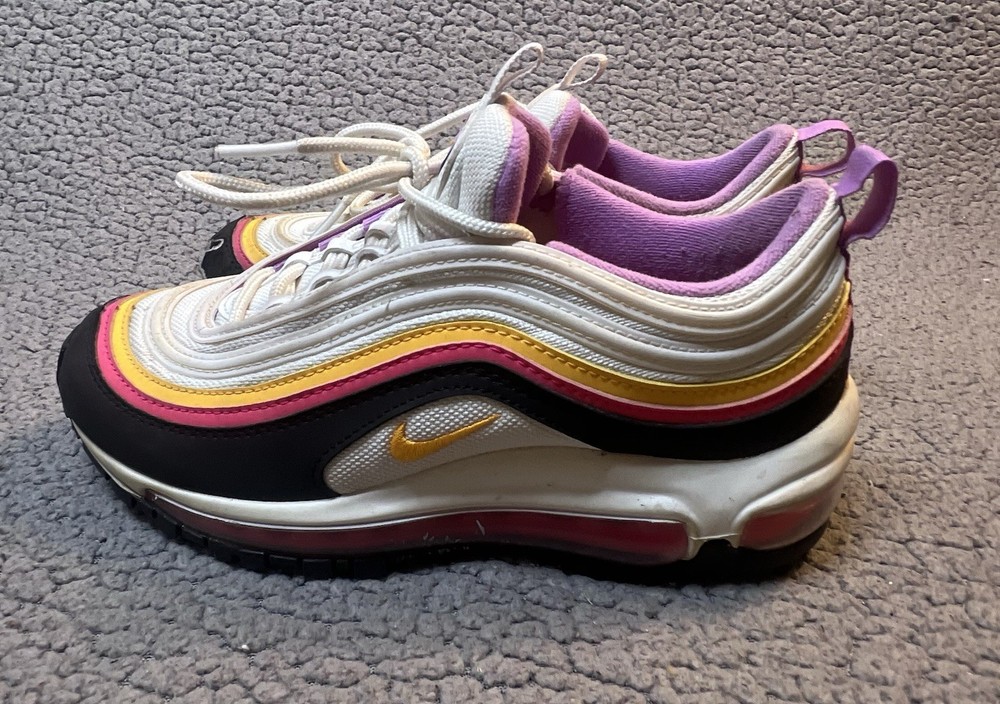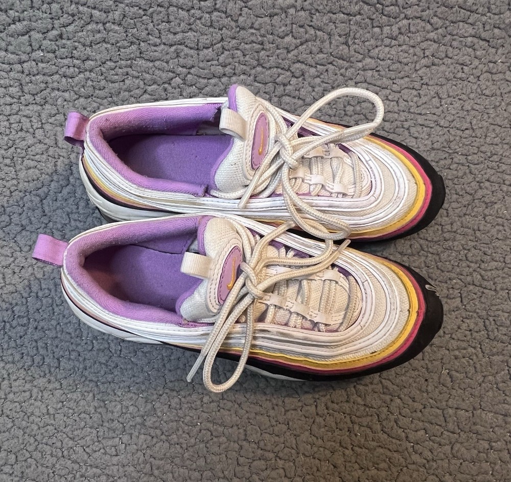 Nike Air Max 97 GS Dawn & Dusk Sneakers Girls Size 4Y White And Yellow DM8353100 good condition any flaws are shown in photos one shoe has what looks to be a slice on front as shown in photos other than that shoes are in good condition SKU(A315)