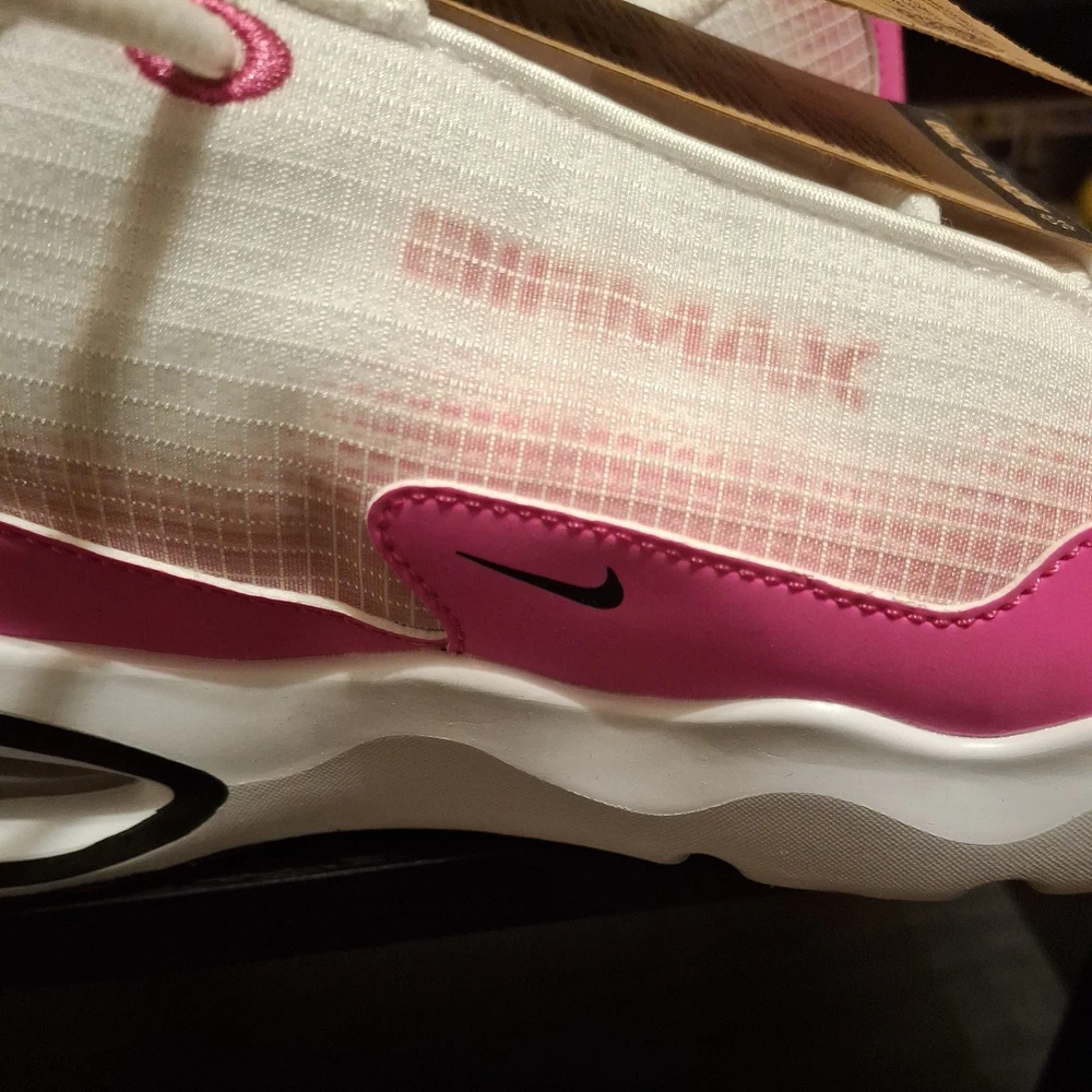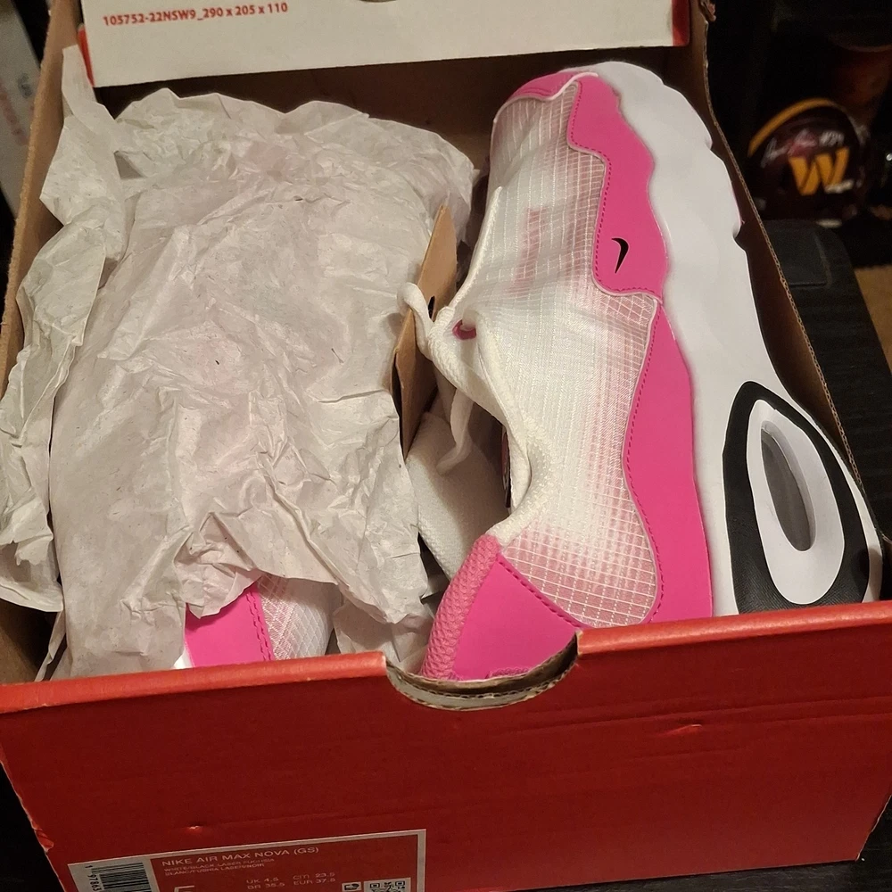 The Nike Air Max Nova (GS) 5Y White/Black/Laser Fuchsia Sneaker is a stylish athletic shoe designed for kids. Featuring a lace-up closure and synthetic upper material, this model offers both comfort and durability. The color scheme of white, black, and laser fuchsia adds a fun and vibrant touch to the design. Perfect for active young individuals, these sneakers are part of the Air Max product line, known for their quality and performance in sports and everyday wear. The sneaker comes with the original box, although the lid is not included.