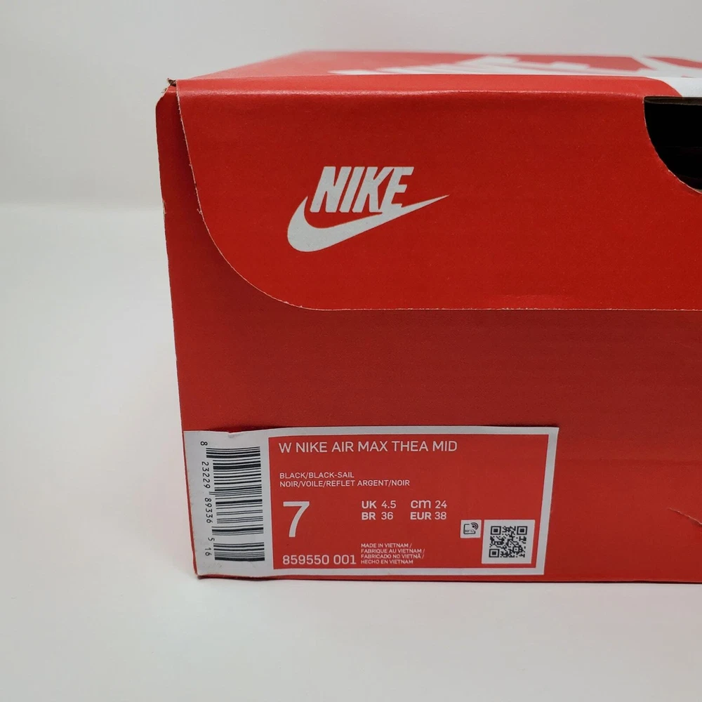 Style Code: 859550-001 Customized: No Style: Sneaker Character: Boots Brand: Nike Department: Women Shoe Shaft Style: Mid Top Product Line: Nike Air Max Type: Athletic Model: Nike Air Max Thea Upper Material: Leather US Shoe Size: 7 Color: Black Year Manufactured: 2016