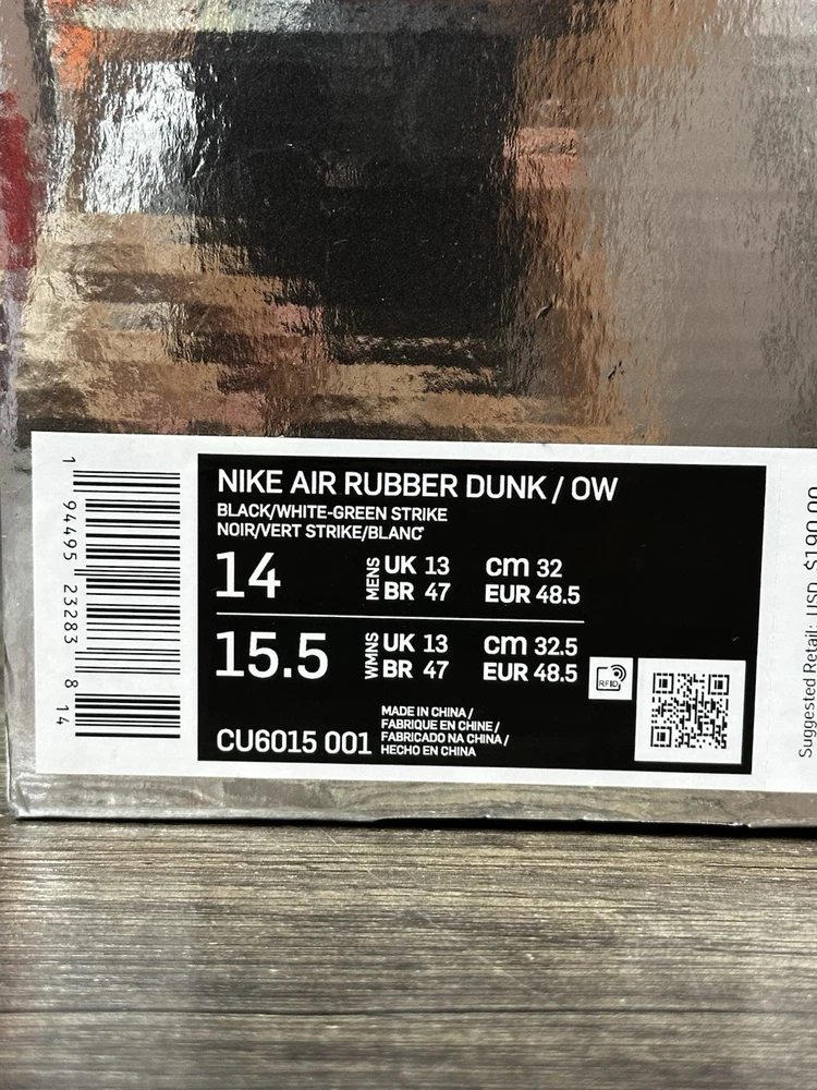 Thank you for visiting our store. We are committed to offering a curated selection of premium footwear with exceptional service. Item: Nike Air Rubber Dunk x Off-White Low Green Strike Size: Men’s Size 14 Style / Item Number: CU6015-001 Condition This pair is New with Box (No Lid) and has never been worn. Please note: the original box may display minor shelf or transit wear such as light dents or small cosmetic marks. The shoes themselves remain in pristine, unworn condition. Authenticity Guarantee Every item we offer is sourced with care and guaranteed 100% authentic. We do not handle fakes, variants, or unauthorized products — authenticity is the foundation of our store. Shipping & Handling Your purchase will be packaged with precision and shipped promptly via the fastest shipping method for a fast and secure delivery experience. We take pride in careful handling to ensure your item arrives in excellent condition. Offers We welcome reasonable offers on all listings. Thank you for choosing our store — we look forward to serving you.