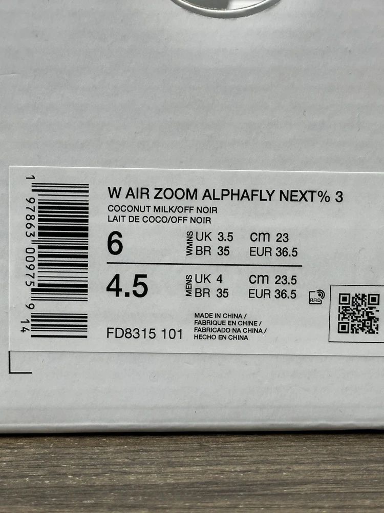 Thank you for visiting our store. We are committed to offering a curated selection of premium footwear with exceptional service. Item: Nike Air Zoom Alphafly NEXT% 3 Coconut Milk Amethyst Size: Women’s Size 6 Style / Item Number: FD8315-101 Condition This pair is New with Box (No Lid) and has never been worn. Please note: the original box may display minor shelf or transit wear such as light dents or small cosmetic marks. The shoes themselves remain in pristine, unworn condition. Authenticity Guarantee Every item we offer is sourced with care and guaranteed 100% authentic. We do not handle fakes, variants, or unauthorized products — authenticity is the foundation of our store. Shipping & Handling Your purchase will be packaged with precision and shipped promptly via the fastest shipping method for a fast and secure delivery experience. We take pride in careful handling to ensure your item arrives in excellent condition. Offers We welcome reasonable offers on all listings. Thank you for choosing our store — we look forward to serving youh.