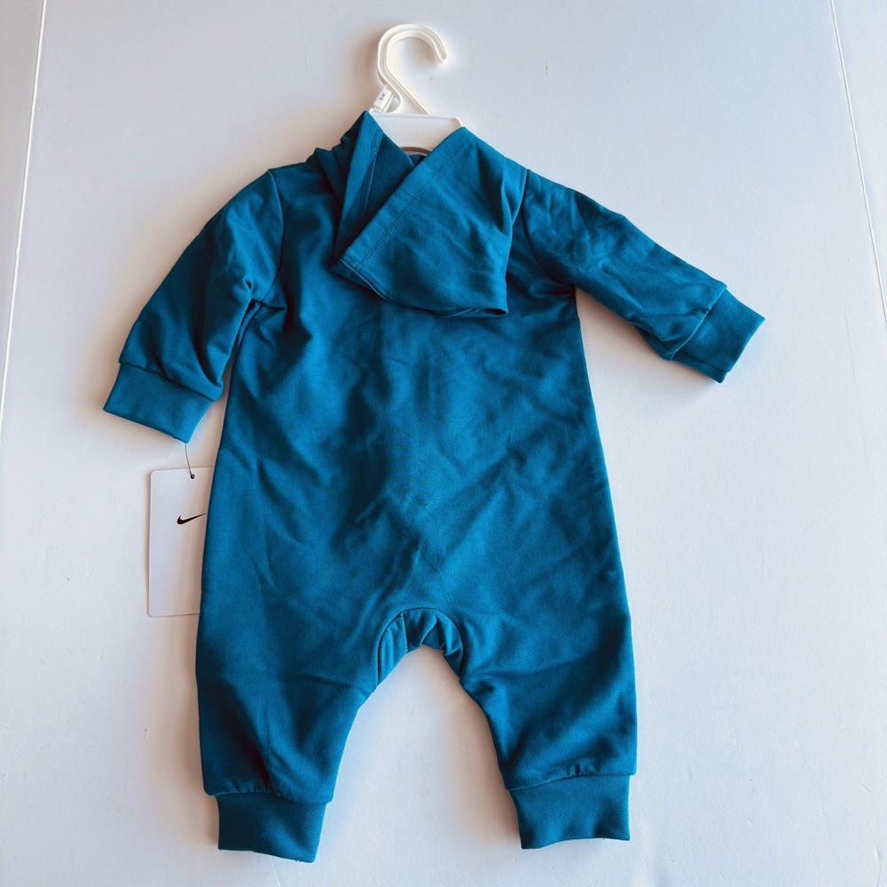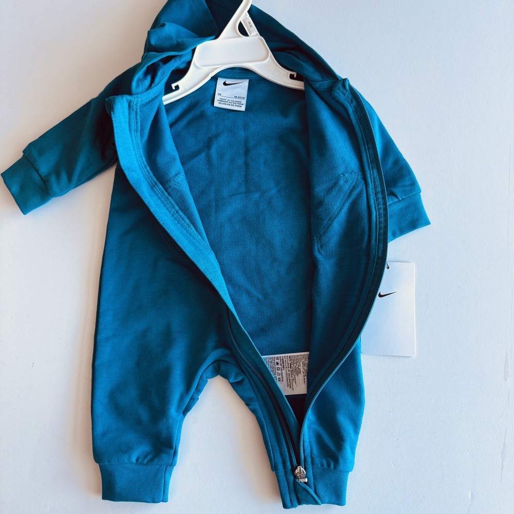 Brand new with tags! This Nike hooded coverall features a smooth full-zip front zipper, faux kangaroo pocket and swoosh logo on left chest. Color: Green Abyss Size: 3 Months Check out all of my listings for clothing, shoes and accessories for babies and toddlers size newborn to 5T.