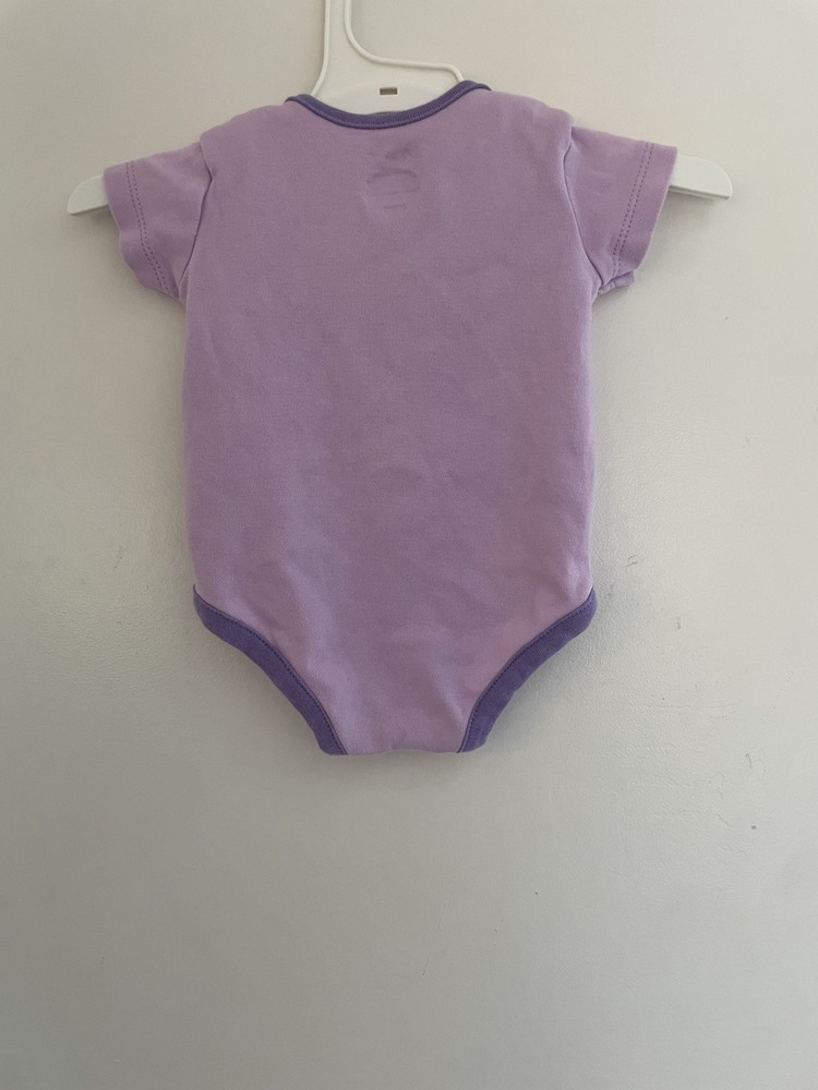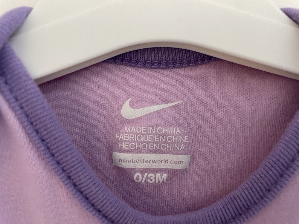Color: Purple Brand: Nike Number of Pieces: 1 Piece Department: Girls Type: One-Piece Features: Comfort, Easy Care, Lightweight, Stretch Seller Notes: “In very good condition. Free of rips or stains.” Material: 100% Cotton Pattern: Graphic Print Occasion: Casual Garment Care: Machine Washable Size: 0-3 Months Sleeve Length: Short Sleeve Season: Spring, Summer Closure: Snap Style: Bodysuit Set Includes: Bodysuit Country of Origin: China