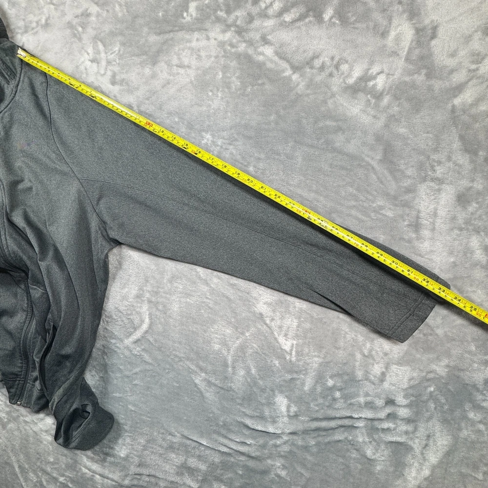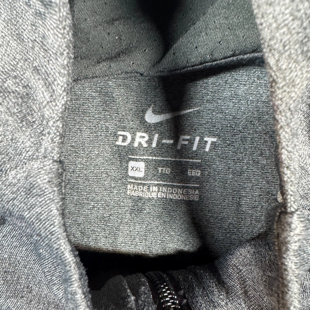 The Nike Basketball Dri Fit Hoodie in Charcoal Gray is designed for men in size 2XL with a loose fit for added comfort during physical activities. This activewear top features long sleeves and a hood for extra coverage, making it suitable for basketball and other active pursuits. The zip closure adds convenience, while the Dri Fit technology helps to keep you dry and comfortable during intense workouts. Perfect for big and tall individuals looking for a reliable and stylish option in activewear.