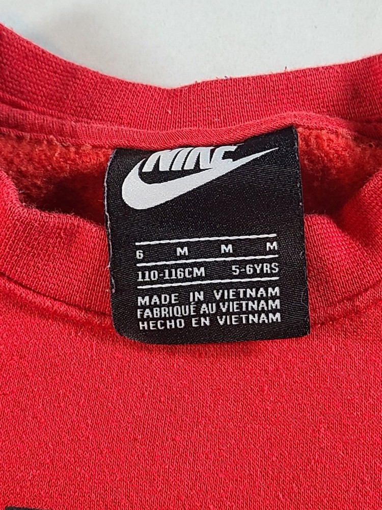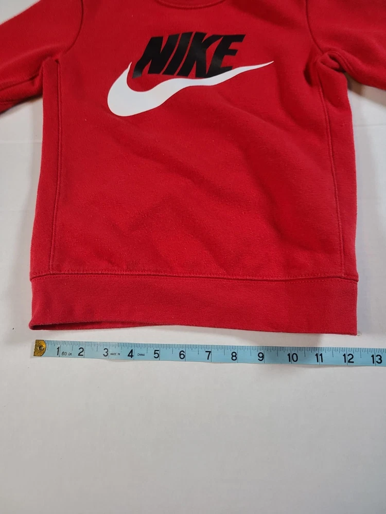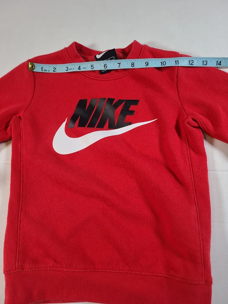 This Nike Boys Red Sweatshirt in size 5-6 is a stylish and comfortable option for young boys. Made from a blended fabric of 60% cotton and 40% polyester, it features a pullover style with a round neckline, long sleeves, and a logo accent. Ideal for travel, activewear, and casual occasions, this sweatshirt is easy to care for and breathable, making it perfect for the winter, fall, and spring seasons. The red color and solid pattern add a pop of color, while the Nike brand adds a touch of sports and logo themes to the design. Perfect for active boys on the go. See photos for measurements approximate. EUC