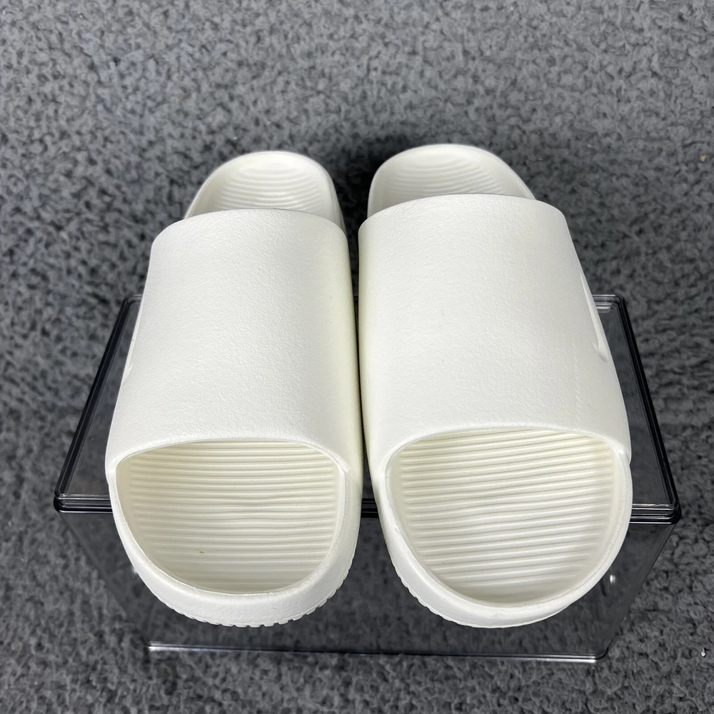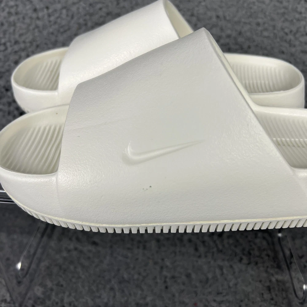 Elevate your casual style with these white Nike Calm Slides in size 5 for women. Designed with a white solid pattern and the Nike logo as an accent, these slide-on sandals are perfect for travel, activewear, and casual occasions. The low heel height and flat style make them comfortable for everyday wear, while the rubber outsole, insole, and upper materials provide durability and support. These sandals are great for sports and college-themed activities, with a cloud-like feel that will make your feet feel relaxed. The standard shoe width ensures a comfortable fit for most women's shoe sizes. Get ready to enjoy the summer, fall, and spring seasons in style with these casual Nike Calm Slides.