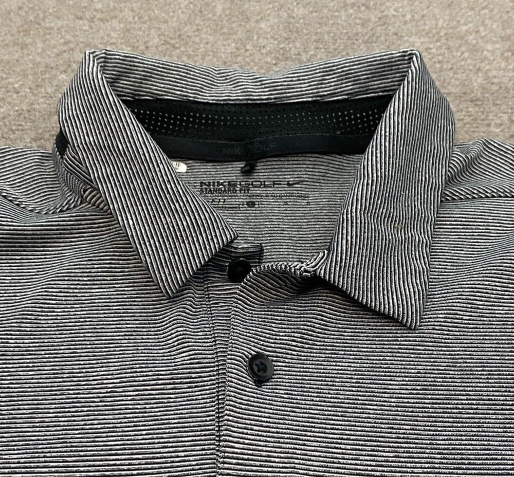 Product Line: Nike Golf Country/Region of Manufacture: Vietnam Theme: Logo, Sports Material: Polyester Blend, 92% Polyester | 8% Spandex Handmade: No Closure: Pullover Neckline: Collared Fabric Type: Blended Fabric Pattern: Striped Sleeve Length: Short Sleeve Brand: Nike Color: Gray Department: Men Model: 850691 010 Performance/Activity: Golf Fit: Regular Size: L Features: Stretch Collar Style: Spread Size Type: Regular Signed: No Garment Care: Machine Washable Fabric Wash: Medium Type: Polo