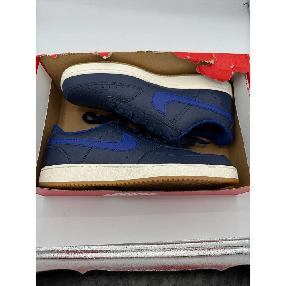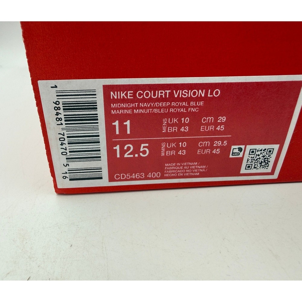 Court Vision Low sneakers merge the fast-break style of 1980s basketball with the fast-paced culture of today's game. These low-top shoes feature a crisp upper inspired by old-school hoops sneakers and a classic rubber cupsole seen on some of the most iconic silhouettes of the past. The midnight navy pebbled leather upper is accented by deep royal blue Swooshes and a clean sail midsole, finished with a durable gum rubber outsole for a timeless look. Brand: Nike Model: Court Vision Low Style Code: CD5463-400 Colorway: Midnight Navy/Deep Royal Blue/Sail/Gum Light Brown Upper Material: Synthetic Leather Outsole: Gum Rubber Closure: Lace-up Toe Type: Perforated Round Toe Silhouette: Low Top Theme: 80s Basketball Retro Keywords: Hoops, Retro, Sportswear, Streetwear, Athleisure, Classic, Navy Blue, Gum Sole, Casual, Everyday, Minimalist, Vintage Inspired, Low-cut If you have any additional questions, please don't hesitate to contact me direclty.