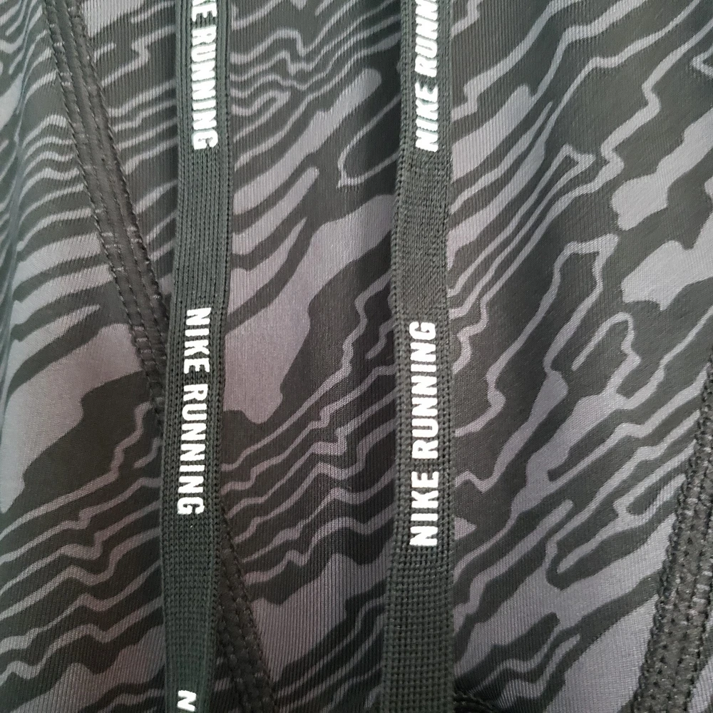 Nike Dri Fit Compression Camo Running Leggings Size M. Zip Ankle, Drawstring Waist. Two back pockets, one with zip close. Reflective tape when running in low light. Black/Gray Camo Pattern. Excellent condition. Returns accepted - buyer pays return shipping.