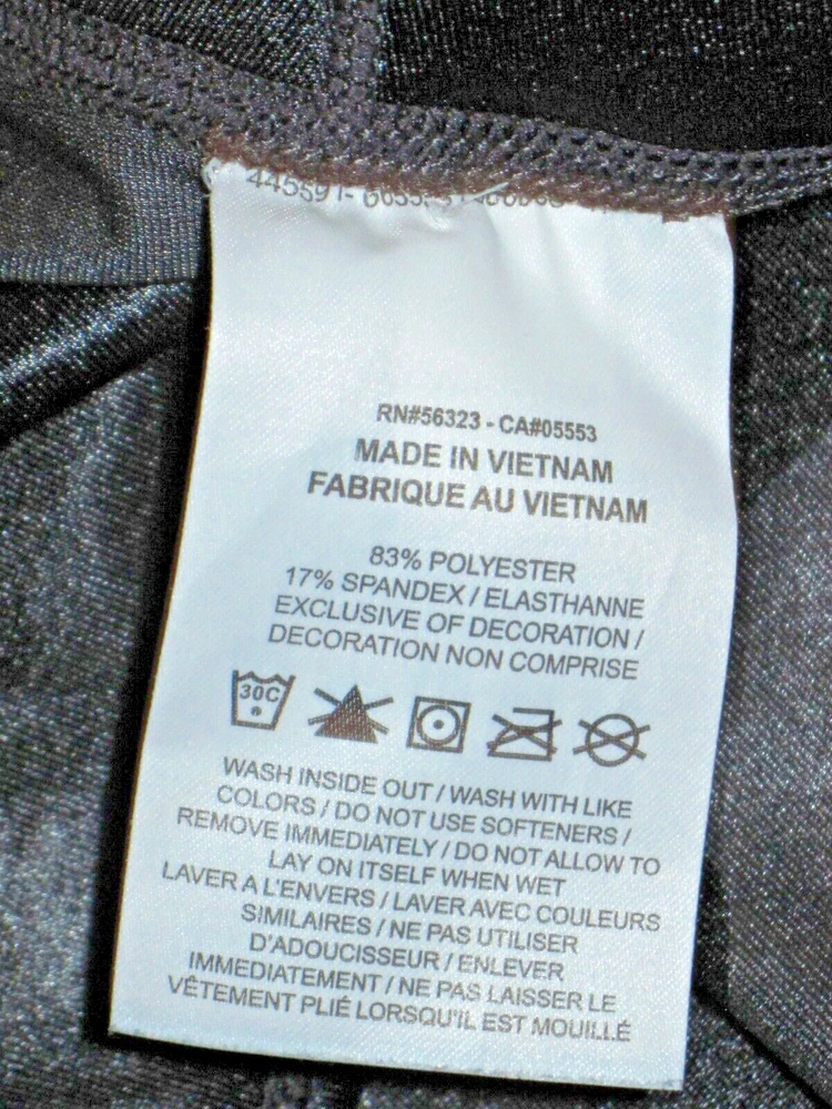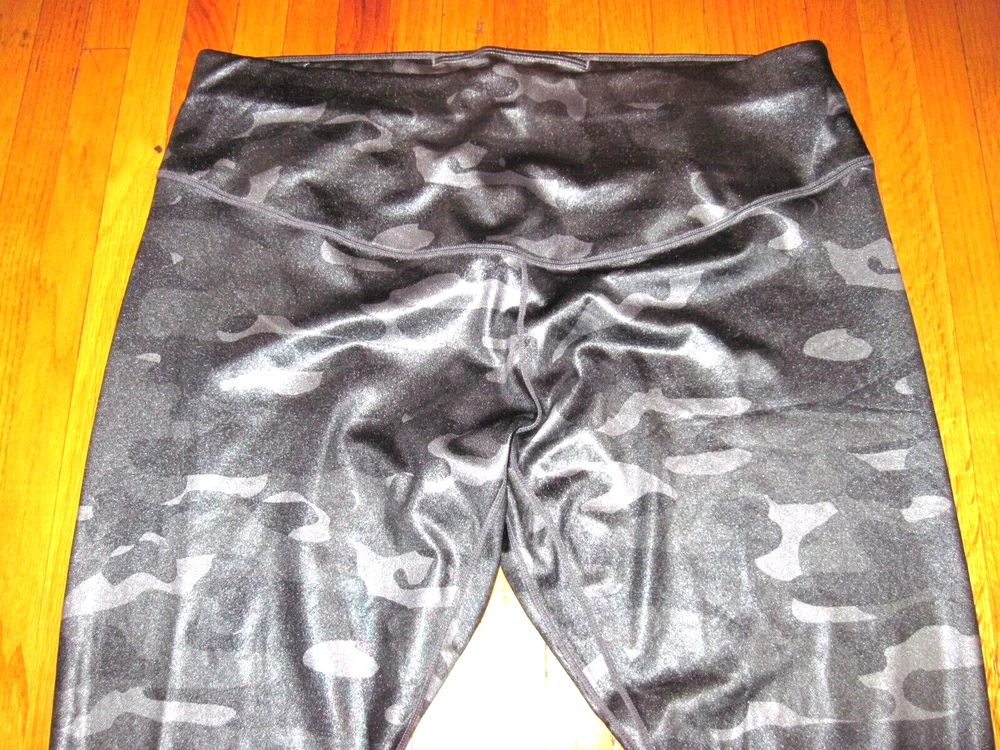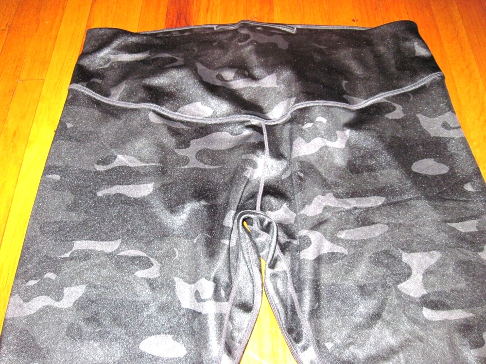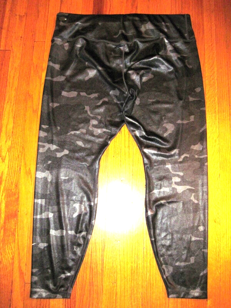 Nike Dri-Fit Black/Gray Metallic Camo High Waist 7/8 Leggings Size 1XL New. Relaxed 42-inch elastic waist, 4-5 1/2-inch wide waistband, with center rear and left front slot pockets. 27-inch inseam. Made of 83% Polyester, 17% Spandex. Come from a pet free smoke free home.