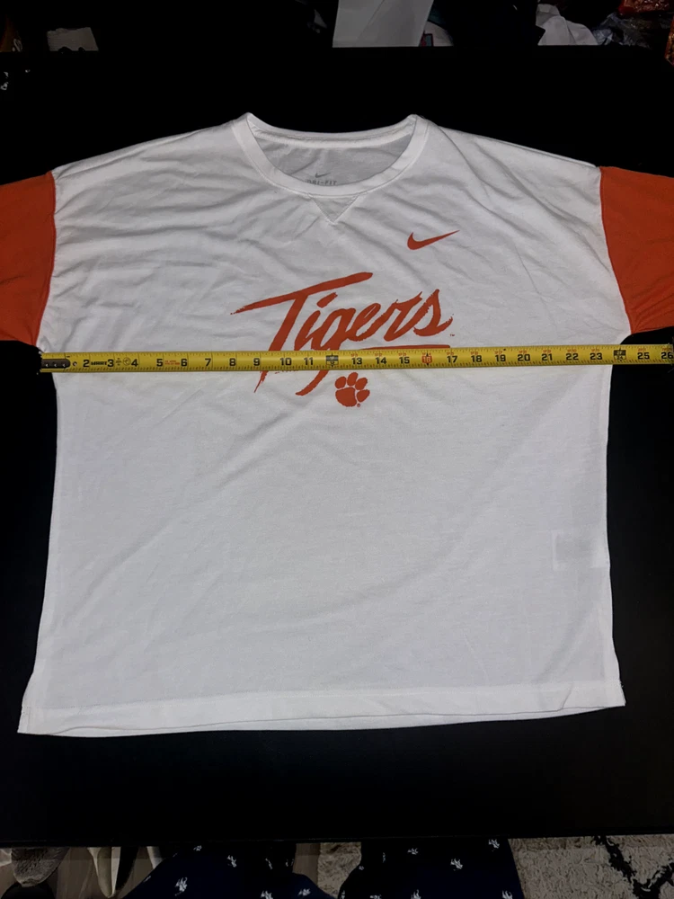 Stay comfortable and stylish as you cheer for your team with the Nike Dri-Fit NCAA Clemson Tigers Women's Long Sleeve Shirt. Designed to wick moisture away from your skin, this shirt keeps you dry during intense basketball games or while you're out and about. The crisp white color complements the vibrant orange and black accents, showcasing your Clemson Tigers pride. Crafted with care in Malaysia, this medium-sized shirt is officially licensed and perfect for regular season games. It's a versatile addition to any fan's wardrobe, ensuring you're ready to represent your team at the next game or any sports-related event. The shirt's quality construction and attention to detail make it a must-have for any dedicated fan.