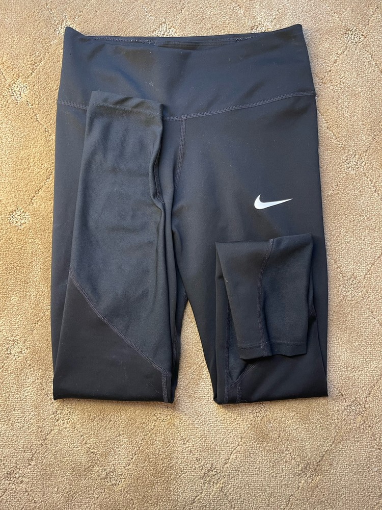 This Nike Dri-Fit Women's Power Victory Leggings in size Small feature a solid black color with a logo detail. Made of a blend of polyester and spandex, these leggings offer a skinny fit with a mid-rise waist and ankle length. Ideal for various activities, they provide compression, moisture-wicking, and breathability for comfort during sports like tennis, running, yoga, and more. Easy to care for with machine washable fabric.