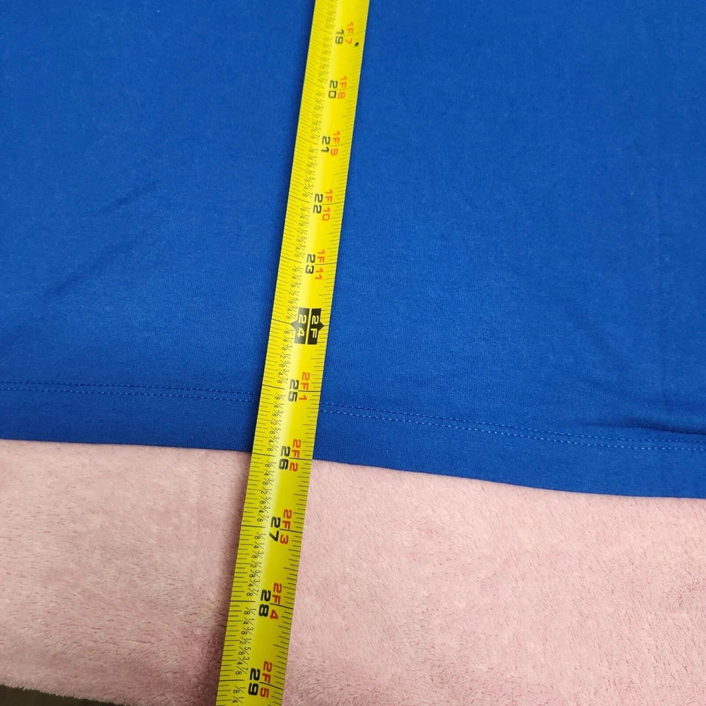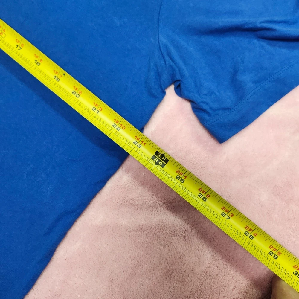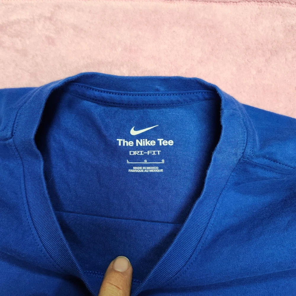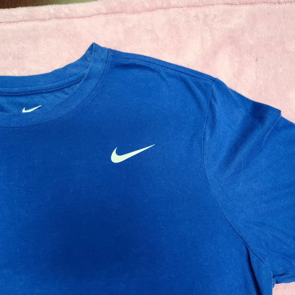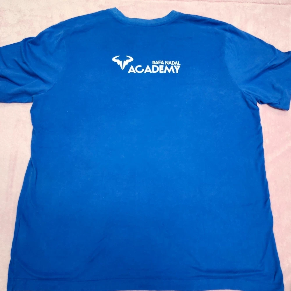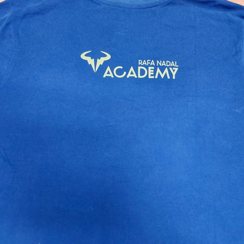 Crafted for athletic performance, this Nike Dri-Fit T-shirt offers moisture-wicking technology and a comfortable fit. Its vibrant blue color and Rafa Nadal Academy branding add a touch of style. • Dri-Fit technology • Rafa Nadal Academy logo • Short sleeves • Crew neck • Breathable fabric Top to bottom = 29 inches