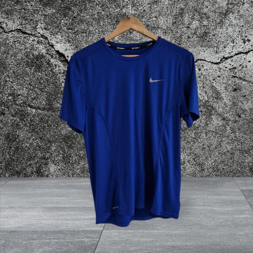 Pit to pit - 20 inches Length - 22 inches Crafted for comfort and performance, the Nike Dri-Fit Running Activewear Top is a must-have for any athlete's wardrobe. This men's large top in a striking blue hue features a round neck and short sleeves, tailored for a regular fit that allows for freedom of movement. The polyester blend fabric is designed to be breathable and lightweight, ensuring you stay cool and dry during intense workouts. The top boasts a solid pattern with a subtle embroidered Nike logo that adds a touch of style to your activewear collection. With its mild compression level, it supports your muscles during various activities, including running, jogging, and cross-training. The Dri-Fit technology is functional across all seasons, making it a versatile choice for year-round gym training and sports activities.