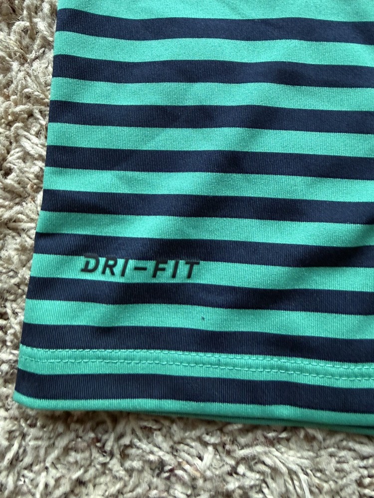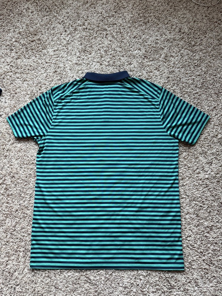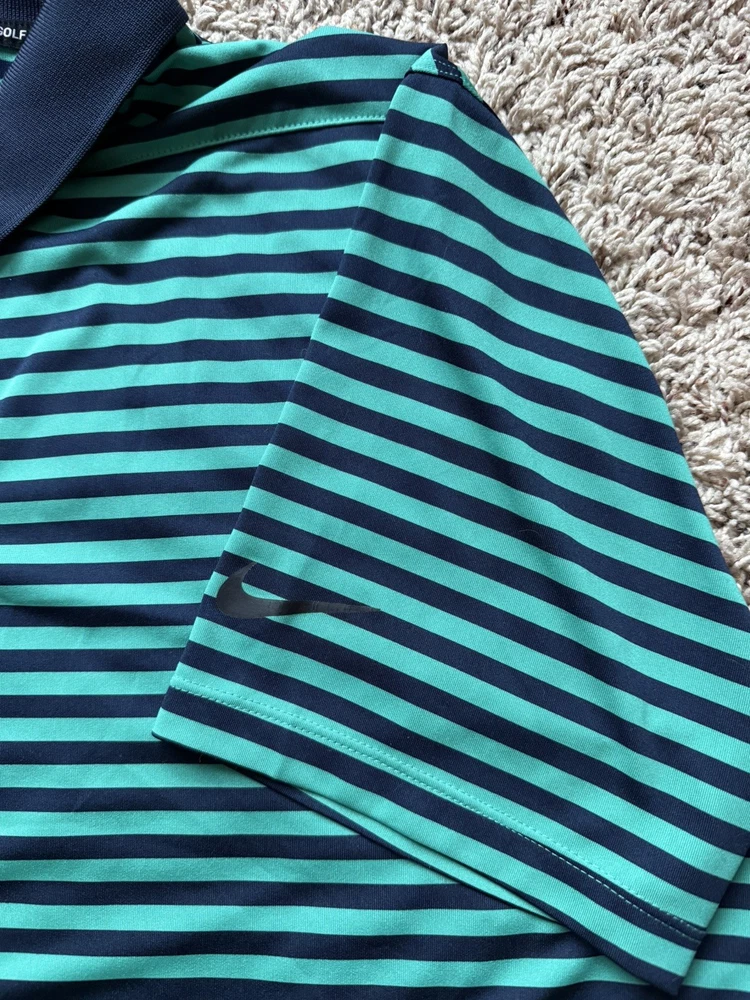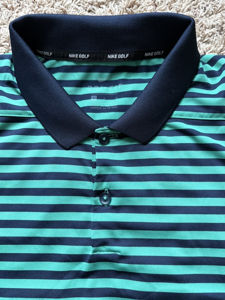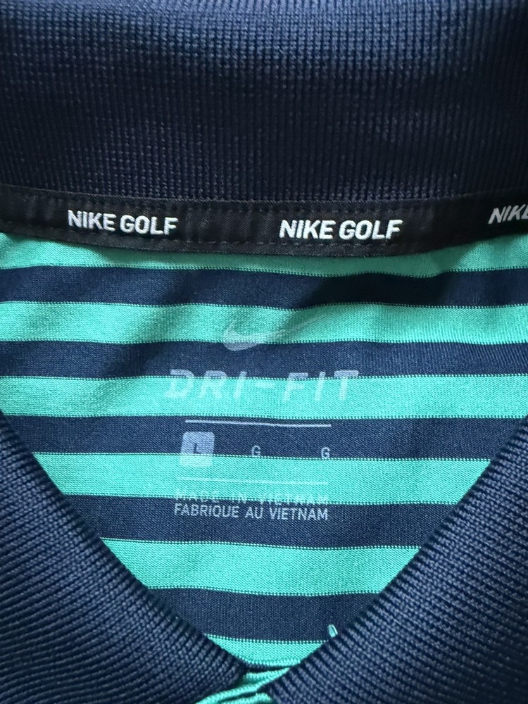 Closure: Button Pattern: Striped Compression Level: Mild Character Family: Golf Handmade: No Neckline: Collared Occasion: Activewear, Casual Product Line: Nike Golf Fit: Regular Collar Style: Spread Compression Area: Chest Performance/Activity: Golf Season: Fall, Spring, Summer, Winter Size Type: Regular Brand: Nike Size: L Accents: Button, Logo Year Manufactured: 2010-2019 Sleeve Length: Short Sleeve Department: Men Signed: No Features: All Seasons, Breathable, Moisture Wicking Personalize: No Garment Care: Machine Washable Vintage: No Theme: Colorful, Logo, Sports Type: Polo Fabric Wash: Medium Country of Origin: Vietnam Character: Blue Style: Polo Material: Polyester Sleeve Type: Casual Sleeve Color: Navy Blue Green Model: Nike Dri-Fit Fabric Type: Knit