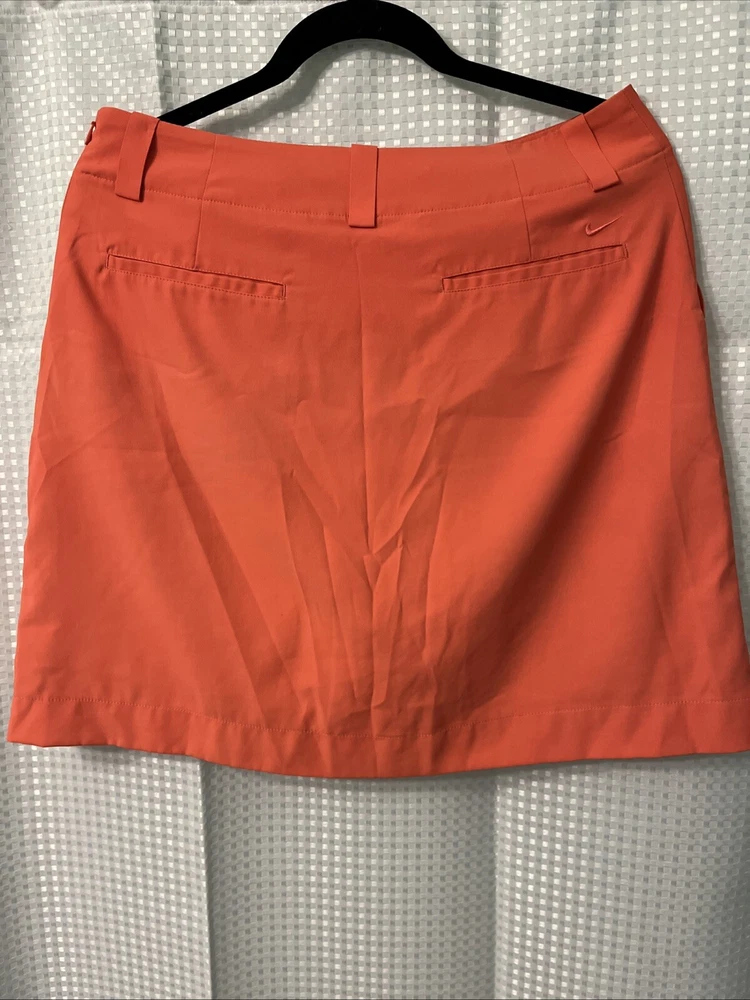 This Nike Dri-Fit Skort is perfect for any active woman. With a beautiful orange color and Nike logo accents, it's a stylish addition to any sportswear collection. The skort is made of polyester blended fabric and features a flat front and zip closure. It's designed to be athletic and comfortable, with a mid-rise and belted features that provide a perfect fit. The skort is machine washable and perfect for any occasion, whether it's for activewear or casual wear. It's a great choice for golfers and other athletes who want to look good while feeling comfortable.